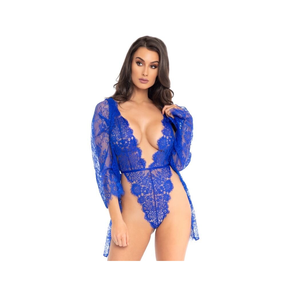 3-teiliger Body aus floraler Spitze mit verstellbaren Trägern und frechem Tanga-Rücken, passendem Spitzen-Bademantel mit Wellenkante und Satin-Krawatte, hergestellt von der renommierten Dessous-Marke Leg Avenue. Steigern Sie Ihre Weiblichkeit und erhalten Sie ein exklusives Stück verführerischer Sinnlichkeit und Eleganz. Größe S / Materialzusammensetzung: 100% Nylon