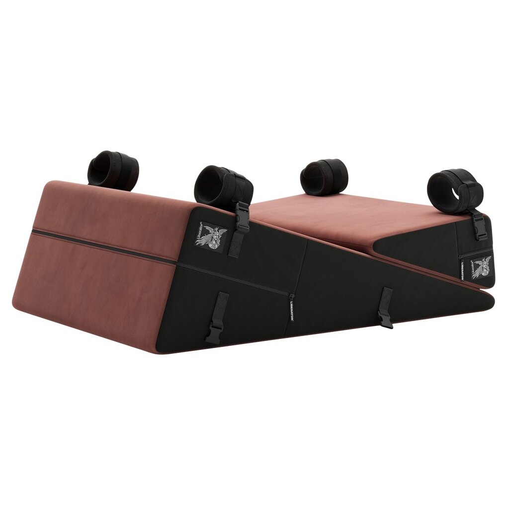 2 different sized, ergonomically wedge-shaped love pillows in a set, Bondage Wedge/Ramp Combo by Liberator, with 4 removable restraints for hands and feet. With soft microfiber covers that stick together non-slip. This allows the small wedge pillow to be placed individually on the large wedge pillow. Both cushions can, of course, also be used separately. The two firm wedge cushions are the perfect and comfortable support for sex positions and oral sex.