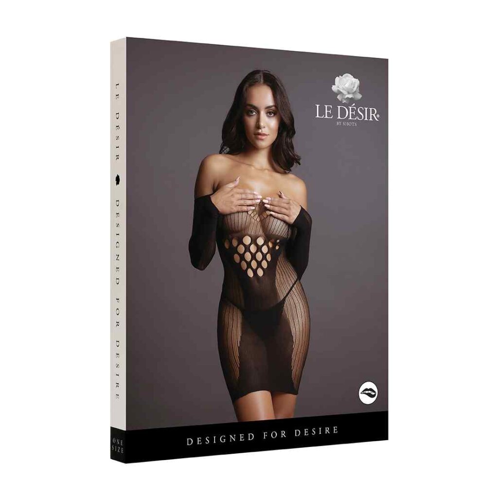 Long sleeved mini dress with contrast net fabric. Cut-out O shapes under the buste and contrast opaque accent that accentuates the body. This dress has some stretch and can be worn from size S to L.