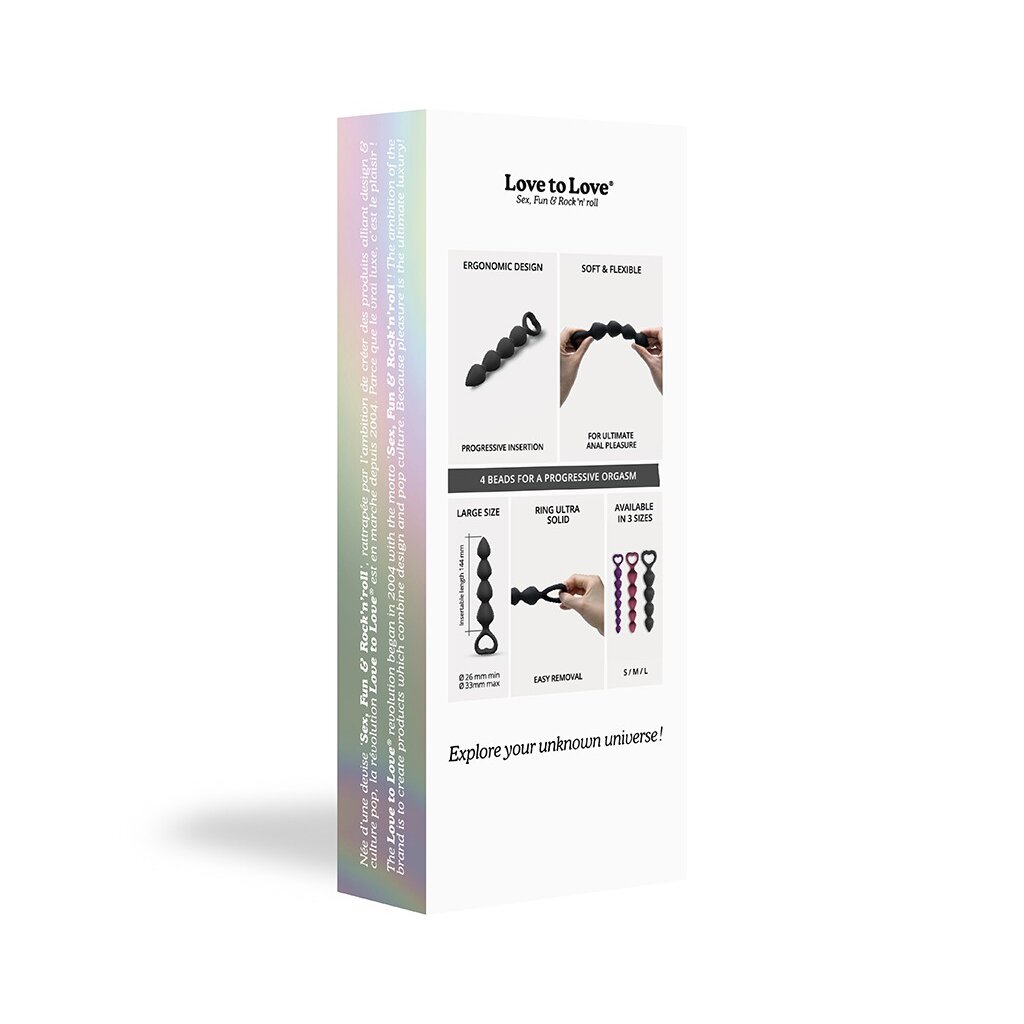 The Bing Bang Anal Beads have a heart-shaped handle and 7 stimulating beads. The toy is soft and flexible, making it easy to insert. The Bing Bang collection is available in different sizes: S, M, L