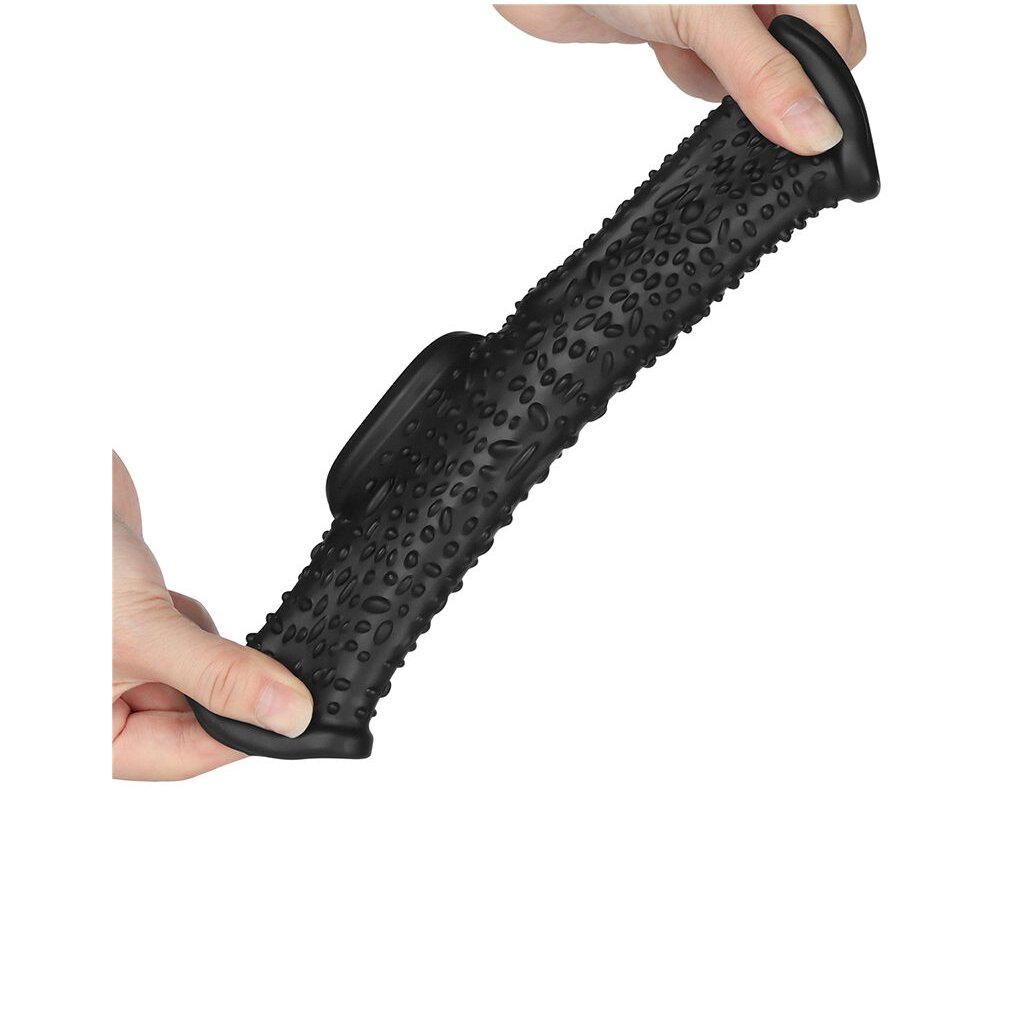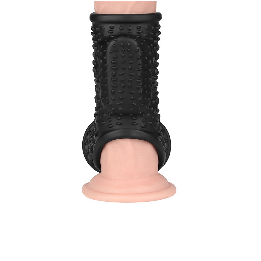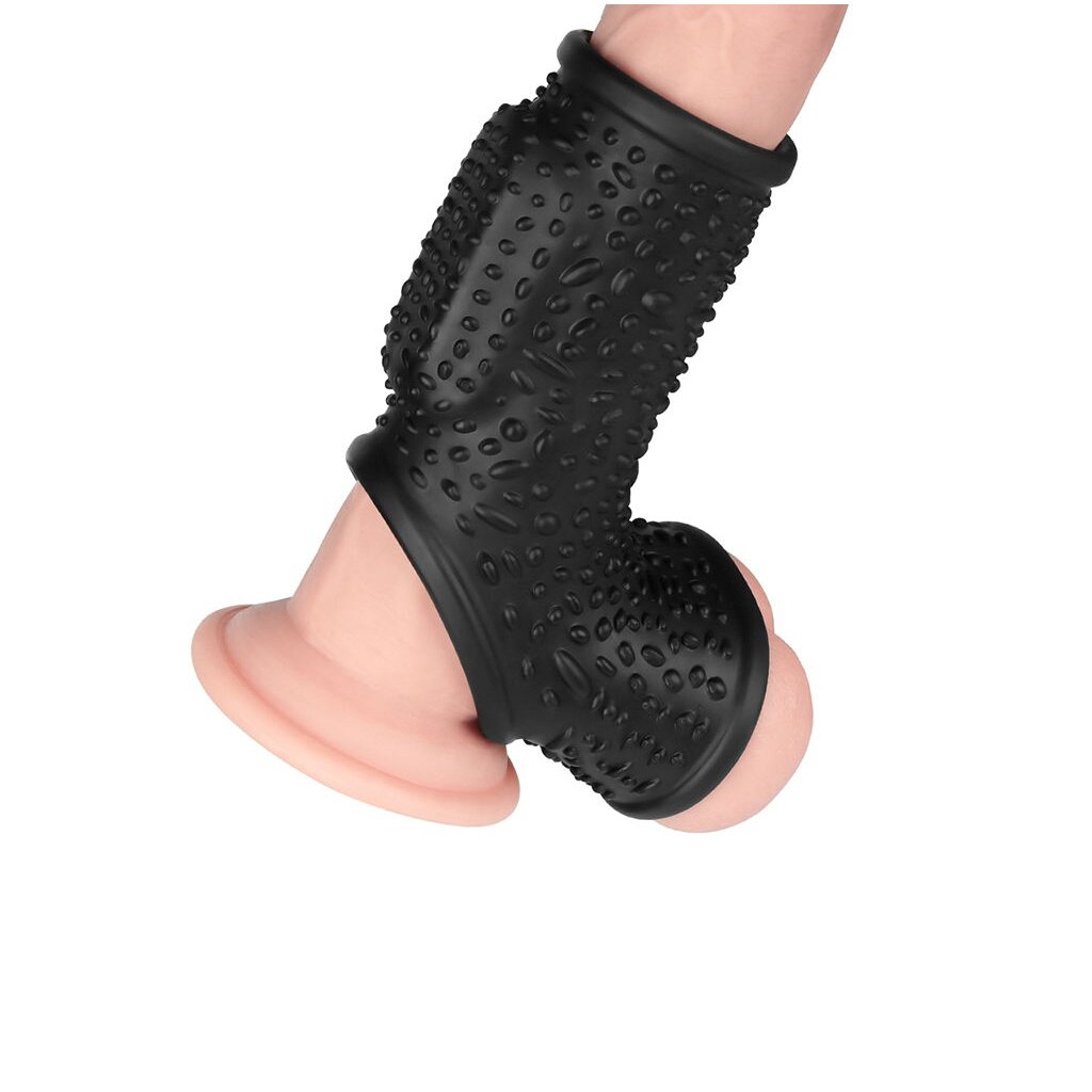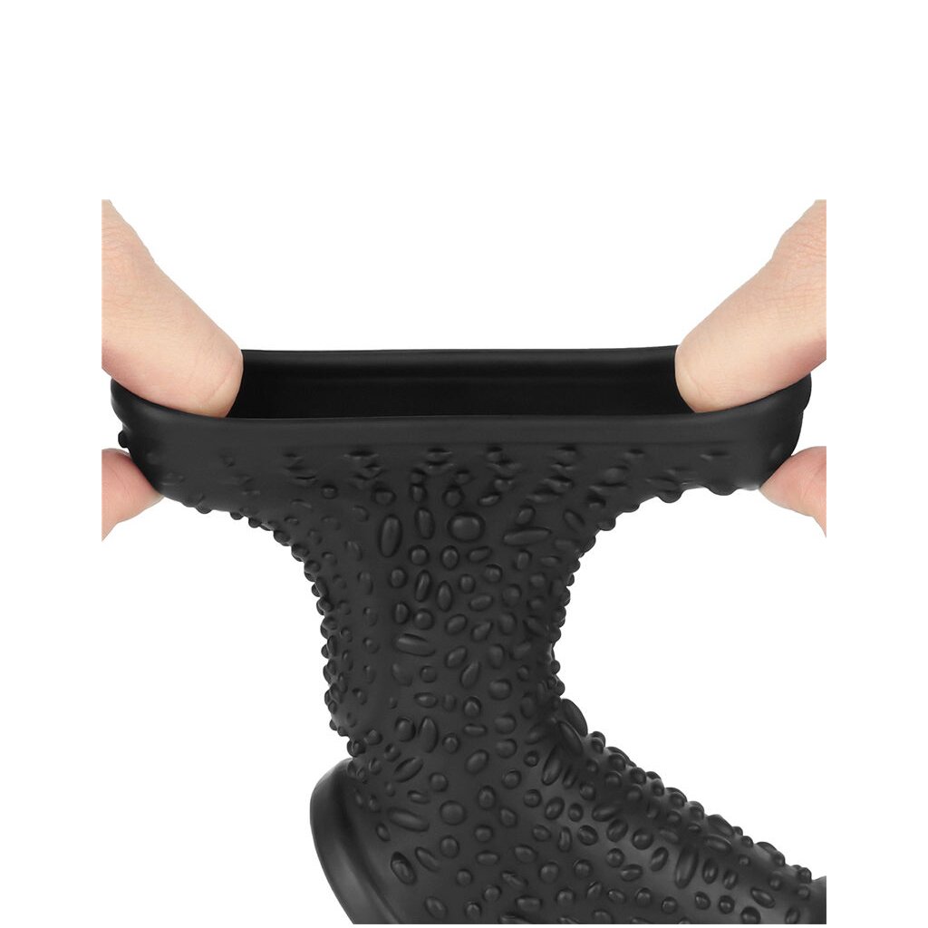 Legen Sie die Hülle für lang anhaltenden Spaß um die Peniswurzel und den Hodensack.