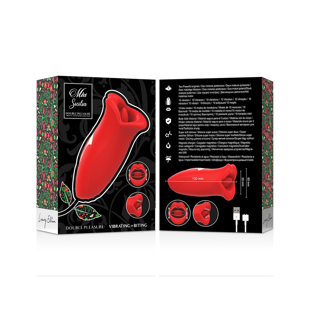 MIA SICILIA est un stimulateur clitoridien précis à usage externe qui vous permet de jouir d'orgasmes multiples aussi souvent que vous le souhaitez. Les vibrateurs conventionnels peuvent engourdir la zone du clitoris et, dans la plupart des cas, vous empêcher d'avoir des orgasmes multiples. Grâce à sa forme exclusive de VRAIE bouche, à sa langue douce et flexible et à son mouvement elliptique révolutionnaire, MIA SICILIA ? vous permet d'atteindre l'orgasme avec une précision sans précédent. Il est parfait pour la stimulation en solo ou le jeu discret avec un partenaire et permet une approche polyvalente de l'auto-plaisir.