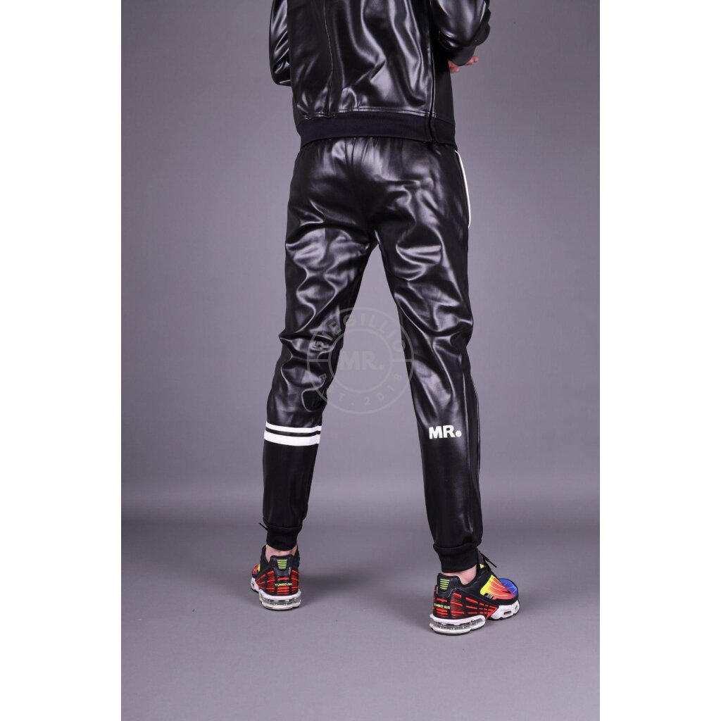 Ce pantalon de survêtement noir à taille basse est doté d'un cordon de serrage à la taille, de poches latérales sur le devant, de poignets côtelés et de rayures blanches sur la partie inférieure de la jambe gauche. Les logos MR. blancs se trouvent sur la cuisse gauche et à l'arrière du mollet droit.