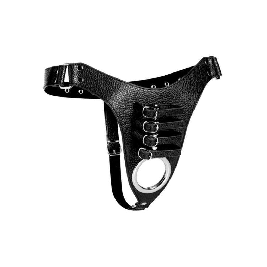 Halten Sie Ihre Augen auf diesen Schwanz! Das einzigartige Design dieses Keuschheit-Gurtzeugs lässt Sie das Vergnügen Ihres Sklaven kontrollieren, während Sie miterleben, wie er um Befriedigung bettelt. Ziehen Sie die unbrauchbaren Penisse durch den Metallring und beginnen Sie den Einsperrungsprozess. Verstellen Sie die Gurte um Hüfte und Po Ihres Partners und ziehen Sie sie fest an. Ziehen Sie den Schwanz nach oben und binden Sie es mit 4 kleinen Gurten, um zu versichern, dass Ihr Sklave fest einsperrt ist! Sie können dann ihre Verzweiflung genießen, wenn sie gegen diese Strapsen kämpfen.