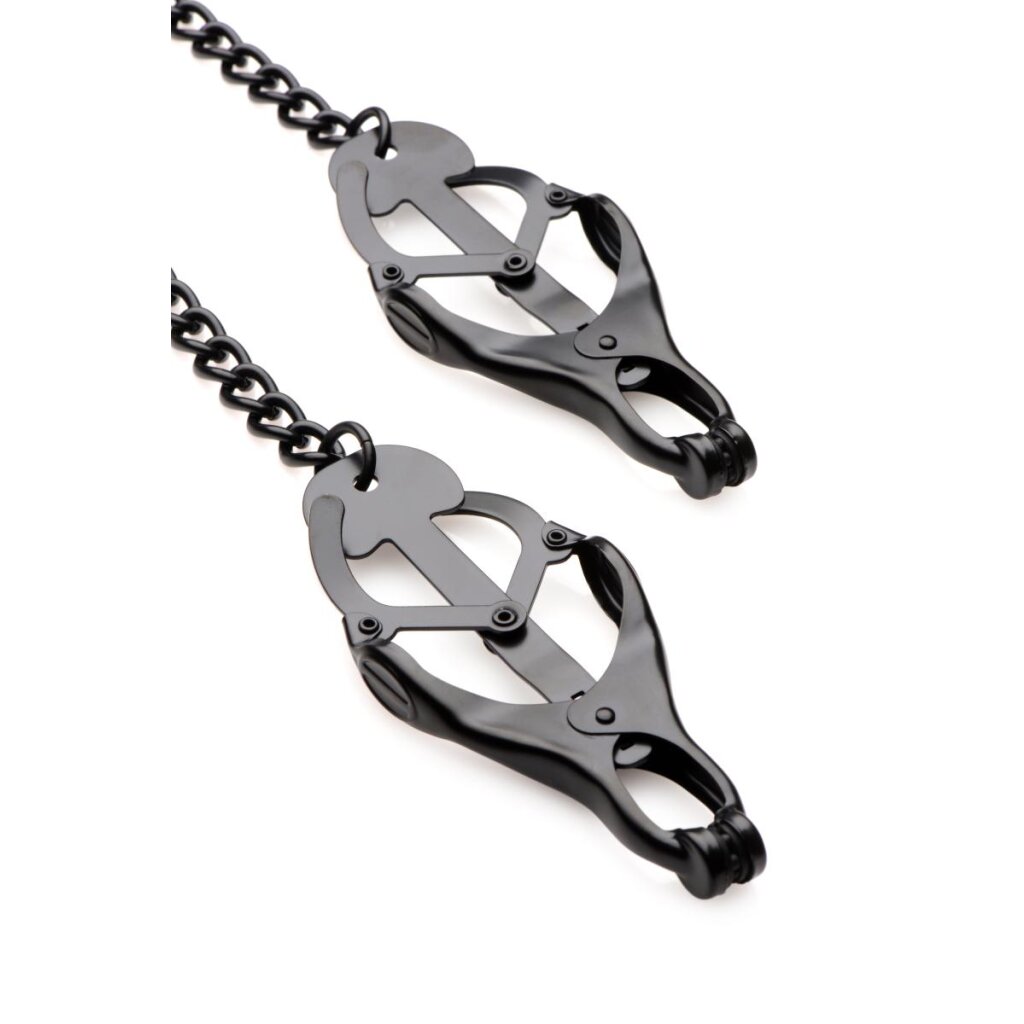 Ein zeitloser Klassiker. Der Monarch Nipple Vice bietet ein leichtes Anfangsgefühl... bis die Kette gezogen wird. Sie werden zunehmend härter, je mehr Spannung auf die Kette ausgeübt wird. Der Kleeblatt-Mechanismus verleiht dem Monarch einen festen und unnachgiebigen Griff am empfindlichen Fleisch. Ideal für das Solospiel oder mit demjenigen, den Sie dominieren wollen.