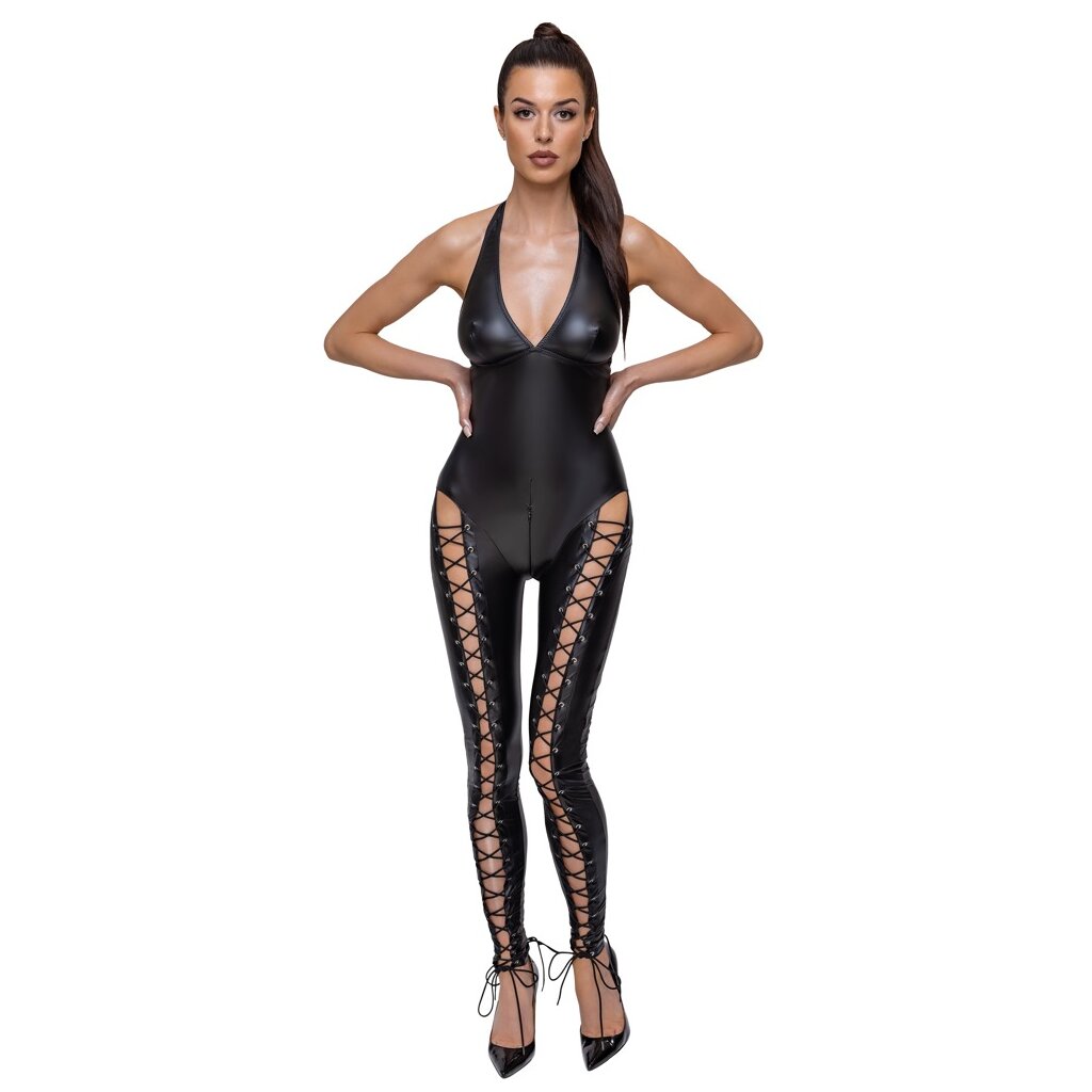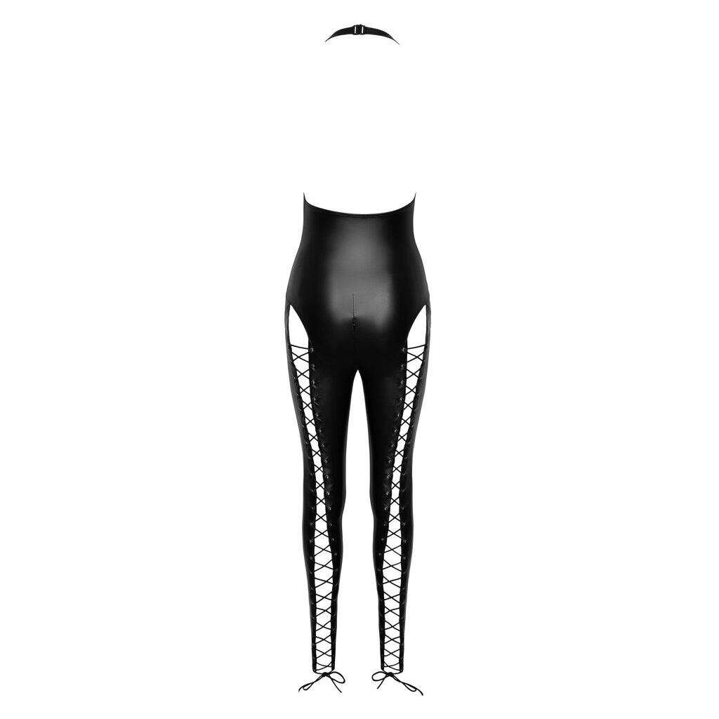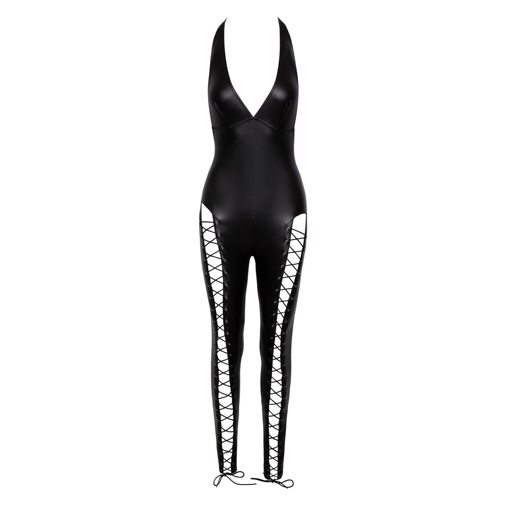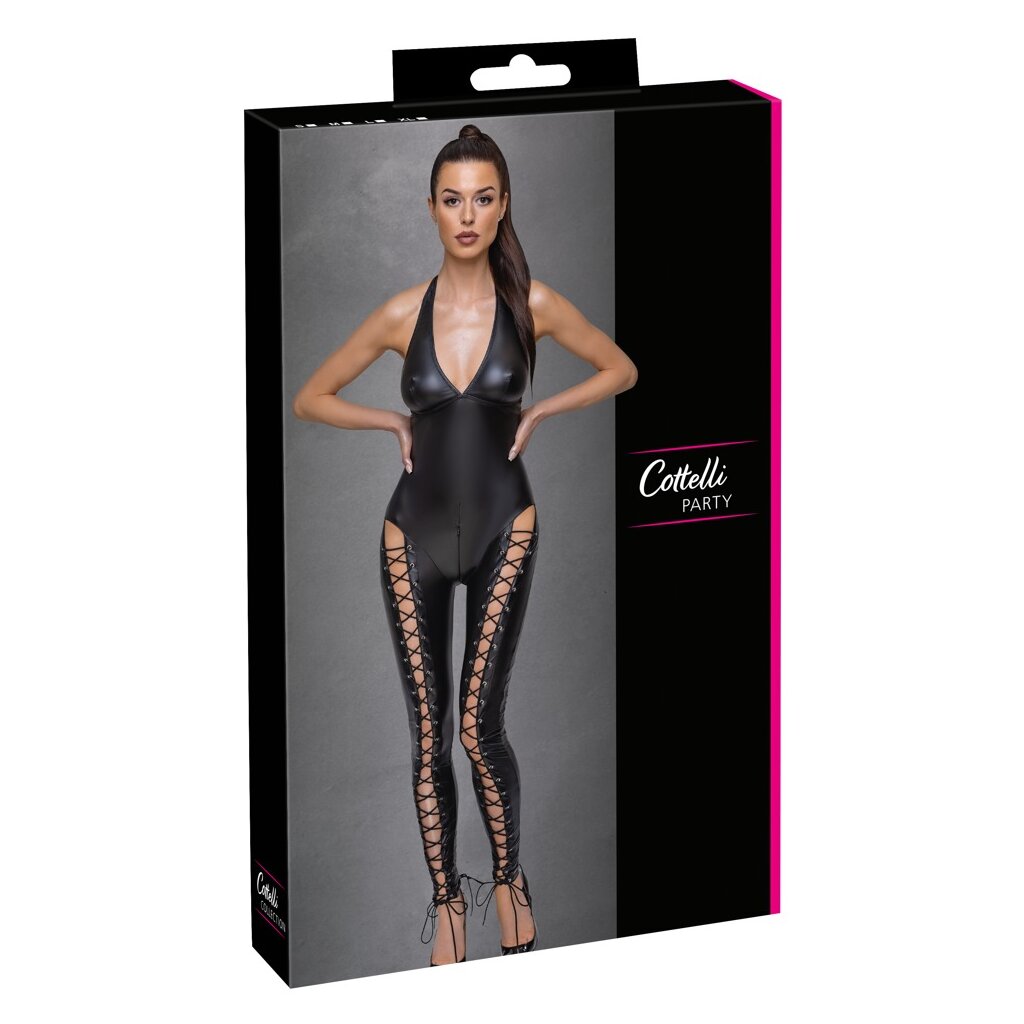 All around elastic jumpsuit by Cottelli PARTY in black matt look. In skin-tight cut with long tight leg, which is provided with a lacing in the front and in the back as well as from top to bottom. In the crotch with practical/erotic 2-way zipper. Backless - halter neck with clip closure.
