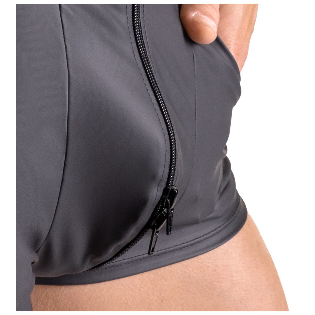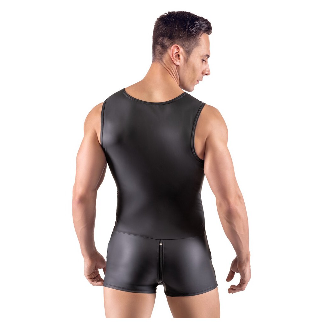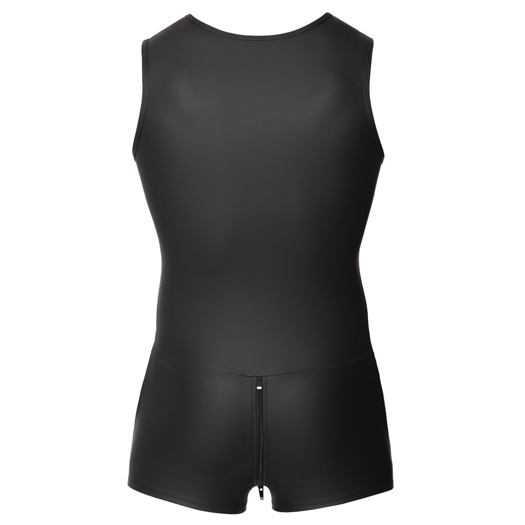 Combinaison sans manches de Svenjoyment avec jambe courte et grandes poches. Découpée tout autour en noir mat très tendance et moulant le corps. Avec une fermeture à glissière à trois voies, du cou jusqu'à l'entrejambe et au-dessus des fesses. La qualité de l'élastique s'adapte parfaitement à la peau et se porte de manière très confortable et pratique.