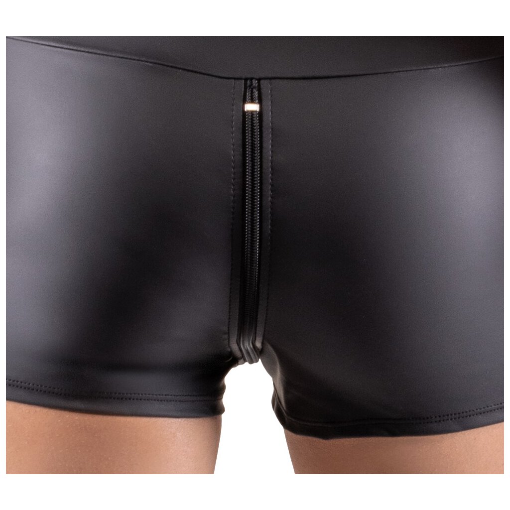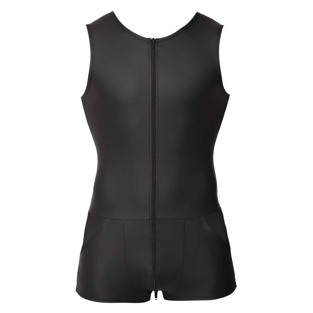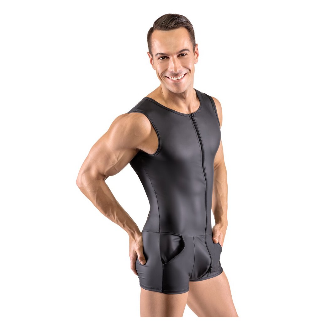 Combinaison sans manches de Svenjoyment avec jambe courte et grandes poches. Découpée tout autour en noir mat très tendance et moulant le corps. Avec une fermeture à glissière à trois voies, du cou jusqu'à l'entrejambe et au-dessus des fesses. La qualité de l'élastique s'adapte parfaitement à la peau et se porte de manière très confortable et pratique.