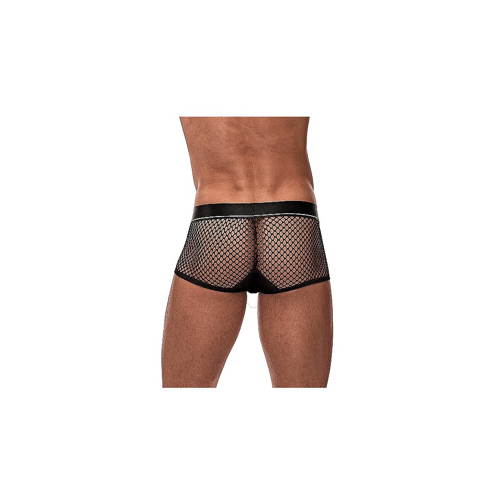 From the Cock Pit Net collection by Male Power, this style includes: a mini cock ring short with cropped legs, a detachable pouch with snap closure revealing a plush elasticated C-ring and a branded satin waistband. Size S / Material composition: 95% polyester 5% elastane