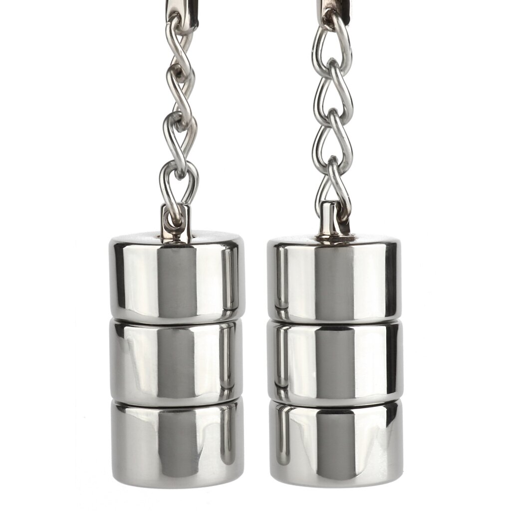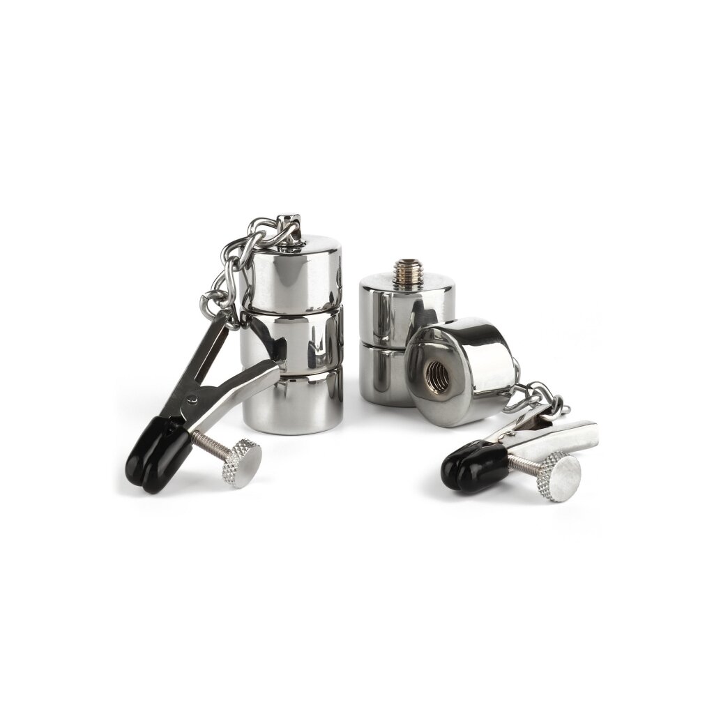 Die Mr. Steel Nippelklemmen mit Gewichten bieten ein intensives Gefühl für fortgeschrittene Nutzer. Diese hochwertigen Edelstahlklammern verfügen über angebrachte Gewichte, die den Druck allmählich erhöhen und so die Empfindlichkeit und Ausdauer steigern. Der verstellbare Mechanismus sorgt für einen sicheren und individuellen Sitz. Ideal für alle, die mit Nippelspielen mit Gewichten experimentieren möchten, bieten sie eine perfekte Balance zwischen Lust und Schmerz. Vor und nach jedem Gebrauch reinigen.