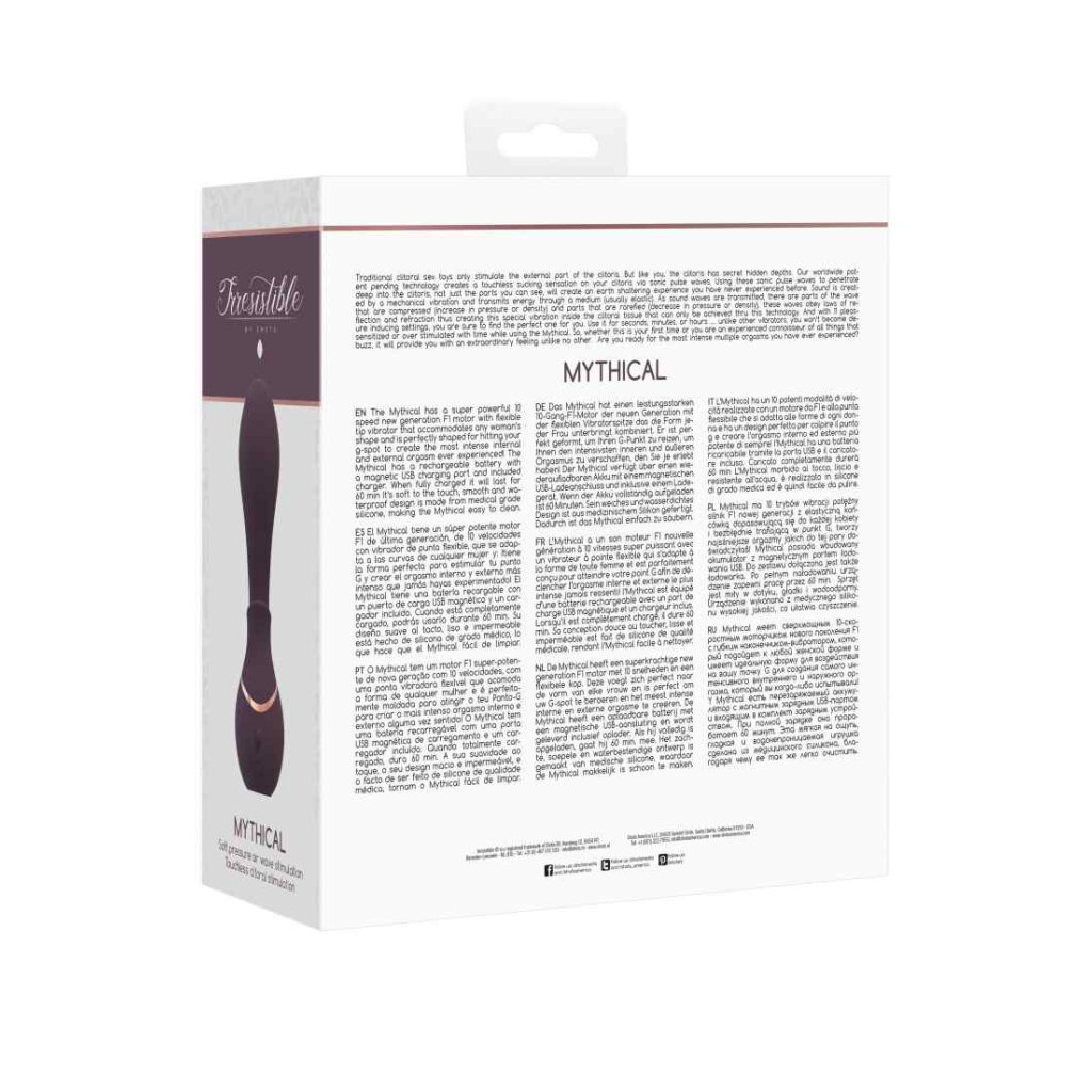 Der Mythical hat einen superstarken F1-Motor der neuen Generation mit 10 Geschwindigkeiten und einer flexiblen Spitze, die sich jeder Frauenform anpasst und perfekt geformt ist, um dein G-Punkt zu treffen und den intensivsten inneren und äußeren Orgasmus zu erzeugen, den du je erlebt hast! Der Mythical hat einen wiederaufladbaren Akku mit einem magnetischen USB-Ladeanschluss und einem mitgelieferten Ladegerät. Wenn er voll aufgeladen ist, läuft er 60 Minuten. Das weiche, glatte und wasserdichte Design ist aus medizinischem Silikon gefertigt, wodurch der Mythical leicht zu reinigen ist.