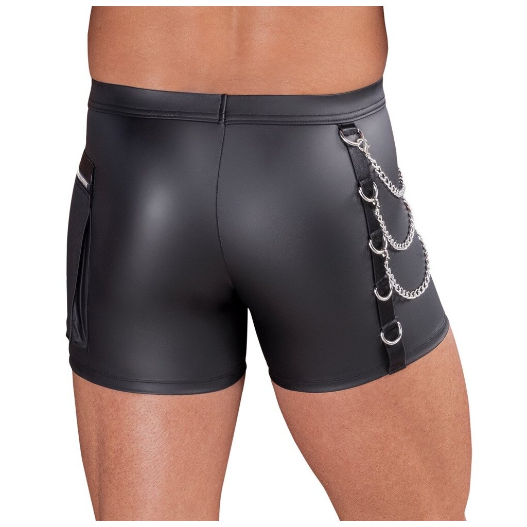 Diese Pants schmiegen sich eng und elastisch an deinen Körper und betonen deine Konturen durch den stylischen schwarzen Mattlook besonders prägnant. Der unterlegte Reißverschluss im Beutel setzt ein funktionales und zugleich erotisches Detail, das den Blick lenkt und dem Design einen zusätzlichen Reiz verleiht. Eine Seite ist mit silberfarbenen Ringen und drei abnehmbaren Karabiner-Ketten ausgestattet, die dem Look einen markanten, kraftvollen Bondage-Touch geben.