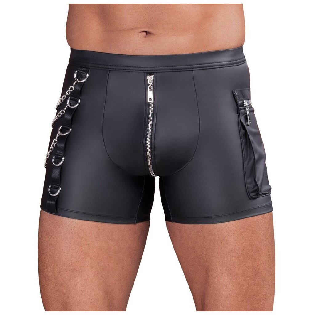 These pants wrap snugly and smoothly around the body, showcasing your shape with a modern black mattlook. The lined zipper pouch adds a versatile, erotic detail. One side features silver rings and three removable carabiner chains, giving the design a bold, striking edge.