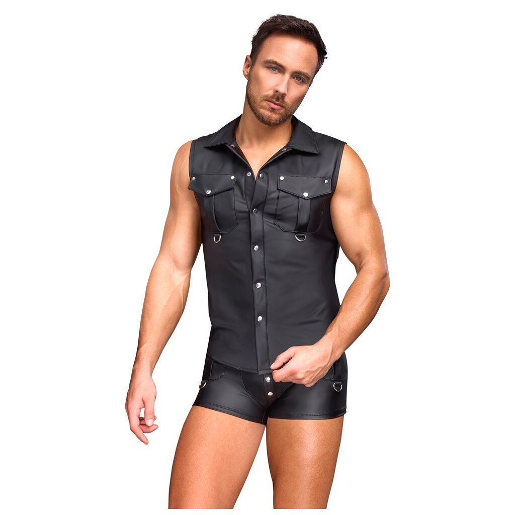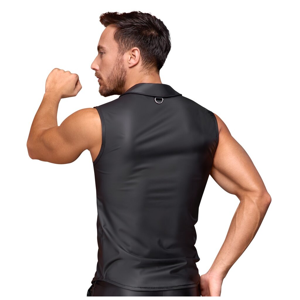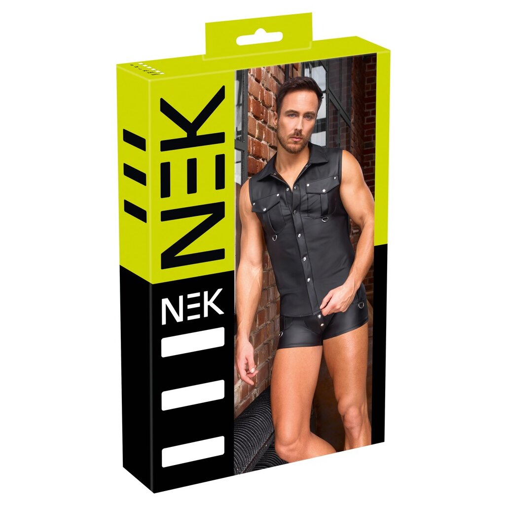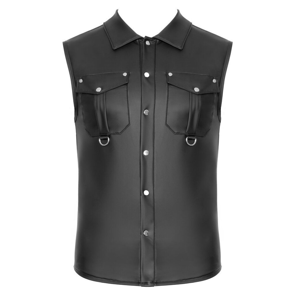 Chemise sans manches de NEK, coupe près du corps, avec patte de boutonnage sur toute la longueur à l'avant. Dans un look noir mat très tendance. Légèrement élastique pour une coupe confortable et ajustée. Deux poches poitrine plaquées avec anneaux en D.