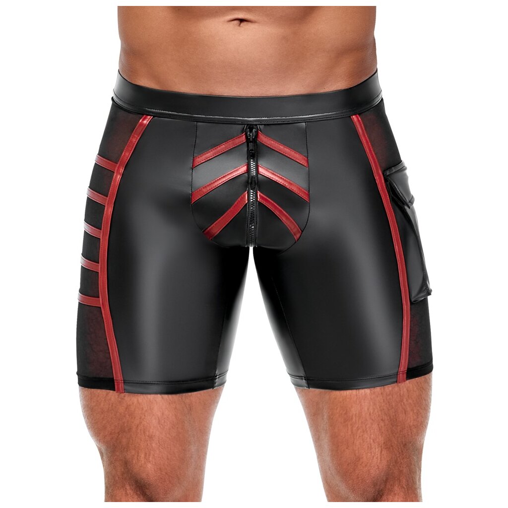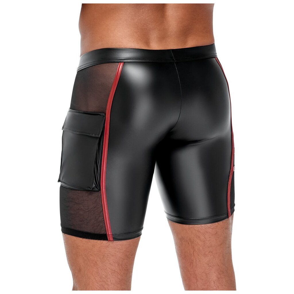 Short moulant de NEK dans un look noir mat avec des rayures rouges contrastées. Insert en filet fin transparent sur chaque côté, poche plaquée à rabat sur la jambe gauche. Pochette avec fermeture à glissière doublée à ouvrir. Doux, élastique et avec un élastique à la taille recouvert pour un confort maximal. Taille L / Composition : 90% polyester, 10% élasthanne ; filet 90% polyamide, 10% élasthanne