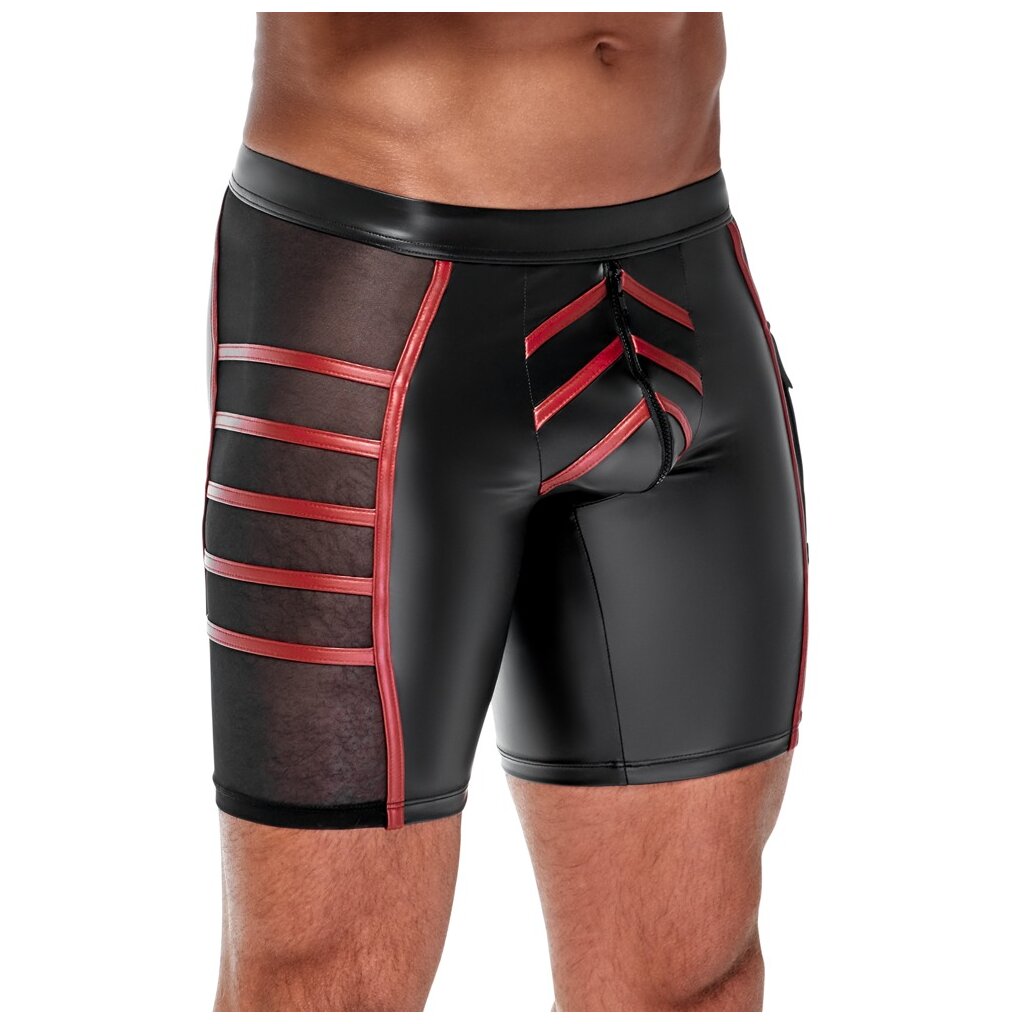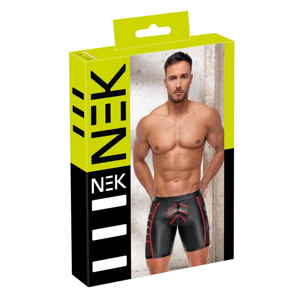 Short moulant de NEK dans un look noir mat avec des rayures rouges contrastées. Insert en filet fin transparent sur chaque côté, poche plaquée à rabat sur la jambe gauche. Pochette avec fermeture à glissière doublée à ouvrir. Doux, élastique et avec un élastique à la taille recouvert pour un confort maximal. Taille S / Composition : 90% polyester, 10% élasthanne ; filet 90% polyamide, 10% élasthanne