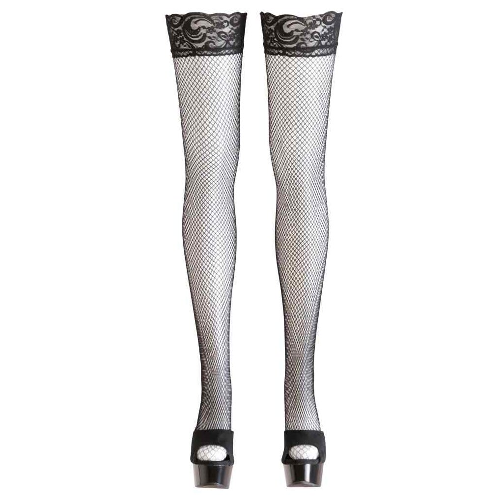 Zeitloser Beinschmeichler! Halterlose Netzstrümpfe mit Spitzenabschluss. Die Silikonbänder im Inneren sorgen für einen rutschfesten Sitz. Änderung der Spitze vorbehalten.