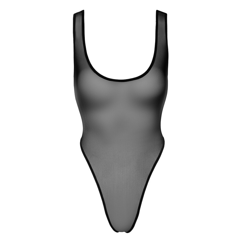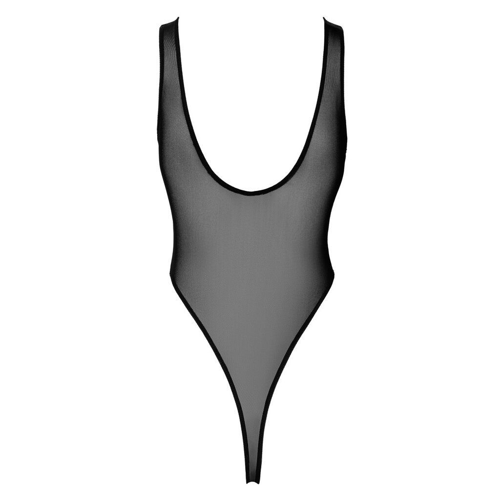 Schwarzer transparenter String-Body von Noir aus feinem Powernet. Hochelastisch und weich und anschmiegsam für hohen Tragekomfort. In engem Schnitt mit großzügigem Dekolleté und tiefem Rückenausschnitt. Extra hohe Beinausschnitte setzen Po und Beine aufregend in Szene.