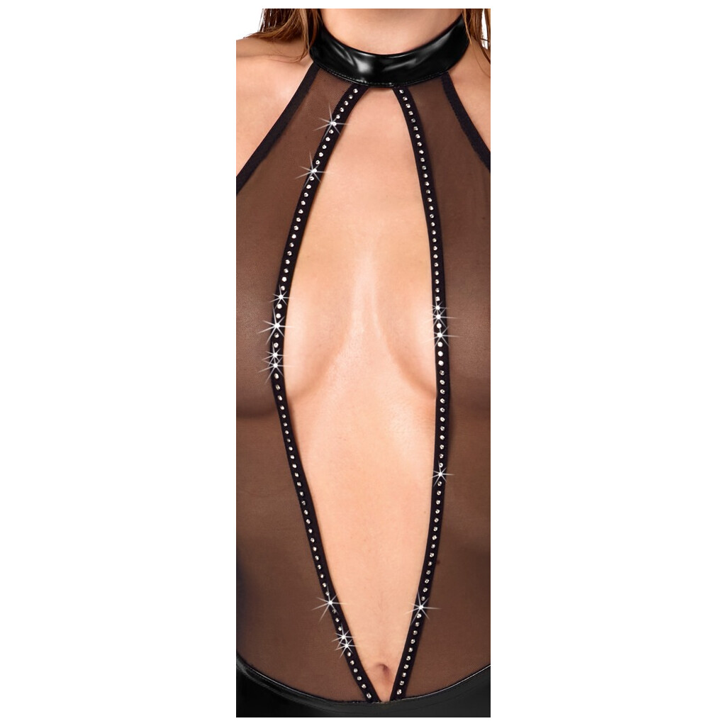 Exklusiver schwarzer Stringbody von Noir im coolen Mix aus glänzendem Powerwetlook und feinem transparentem Powernet. Der aufregende Schnitt präsentiert sich schulter- und rückenfrei mit Stehkragen-Neckholder zum Knöpfen.