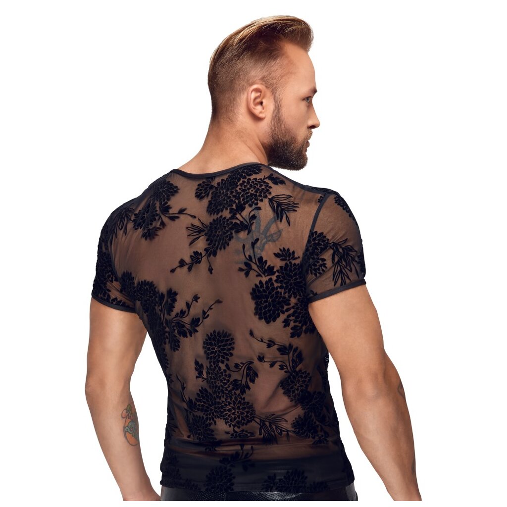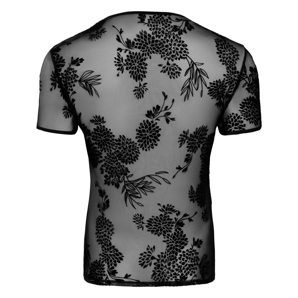 Tight accentuating half-sleeved shirt by Noir made of fine transparent powernet with noble paradise velvet flock print in floral look. All around soft and elastic for high wearing comfort.