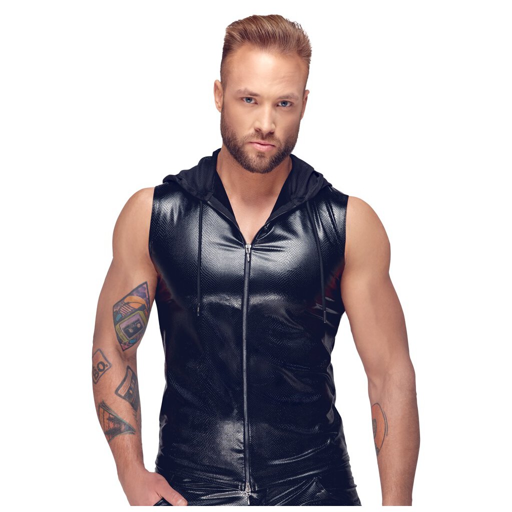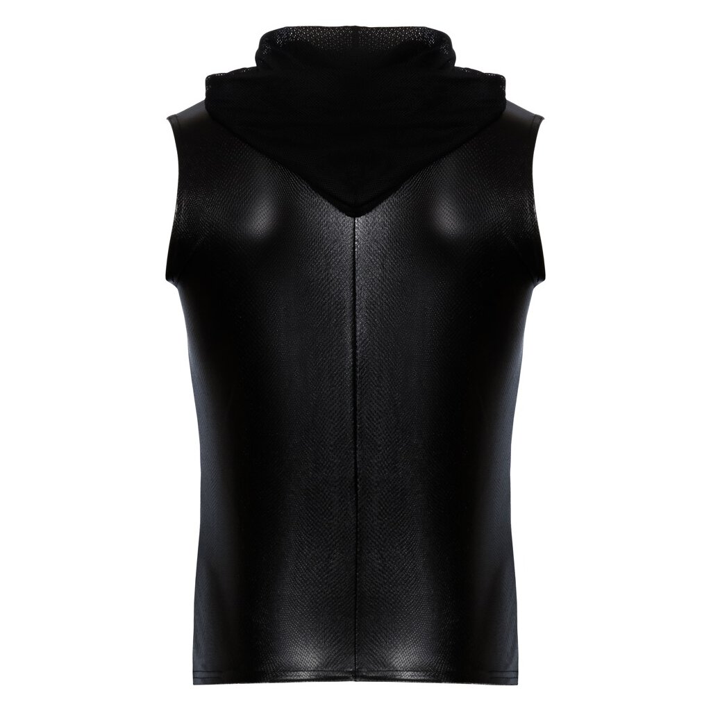 Kurzes ärmelloses Shirt von Noir in schillernder Schlangenhaut-Optik. Fantastisch elastisch für hautnahen Sitz und hohen Tragekomfort. Stylisch mit Kapuze aus feinem weichem Powernet mit Kordelzug. Vorne durchgehender 2-Wege-Reißverschluss.