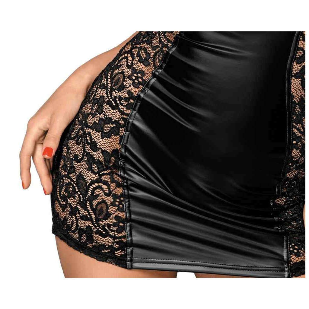 Tight-fitting dress that is fitted at the waist. It is made out of shiny, black, matte power wet look and has a wide lace insert at either side. It is low cut at the front and the back. It also has thin straps.