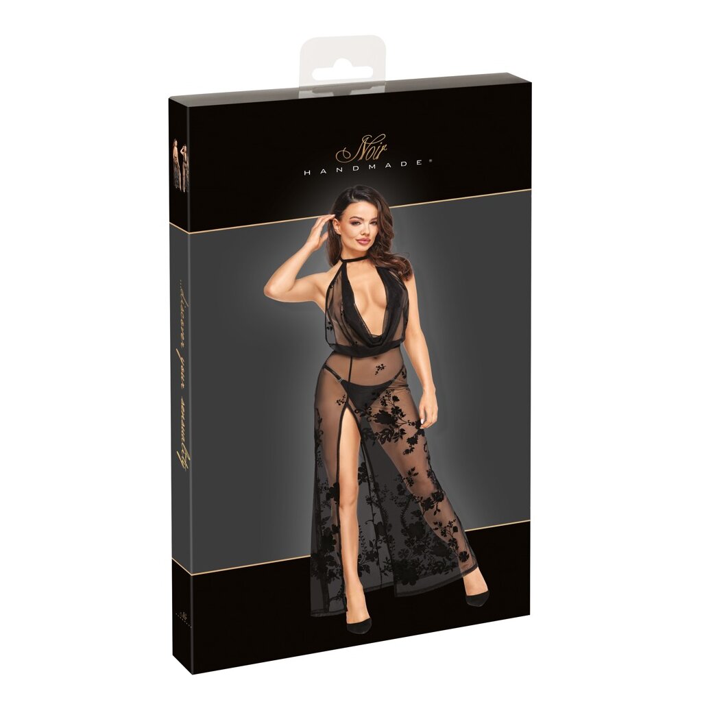 Langes, schulterfreies Kleid von Noir aus feinem schwarzem Stretch mit Samt-Flockdruck in floraler Rankenoptik. Tiefer Wasserfallausschnitt vorne unter dem schmalen Träger mit Hakenverschluss. Aufregender Schlitz bis zu den Hüften. Hinten offen bis zum Hintern!