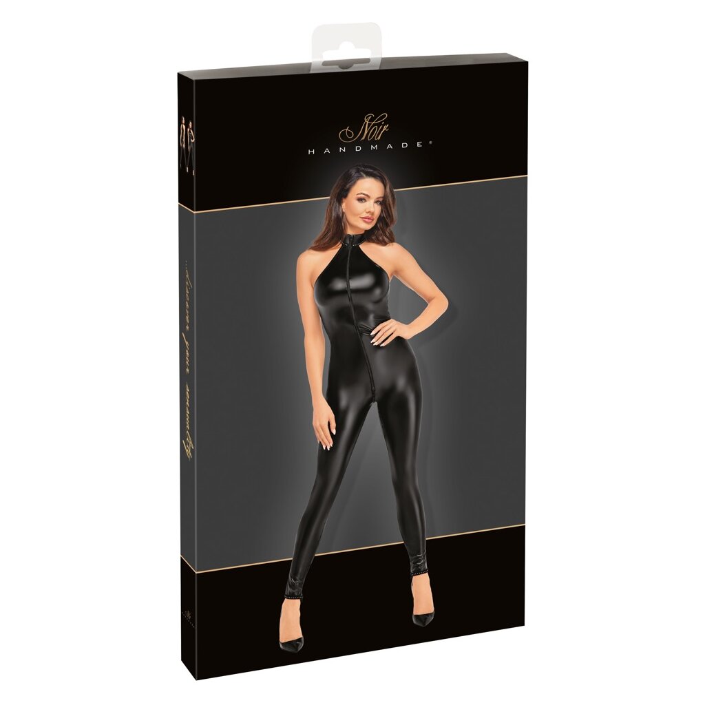 Emphasising jumpsuit by Noir in black powerwetlook - fits like a second skin. Soft and elastic for maximum comfort. Close-fitting off-the-shoulder style with sparkling rhinestones on the stand-up collar - as well as on the hems of the long, slender legs. Short zips are also used here for easy dressing and undressing. Practical and erotic at the same time is the full-length 2-way zip that runs from the collar through the crotch to above the bottom. Size S / Material composition: 76% polyester, 24% spandex, polymer coating