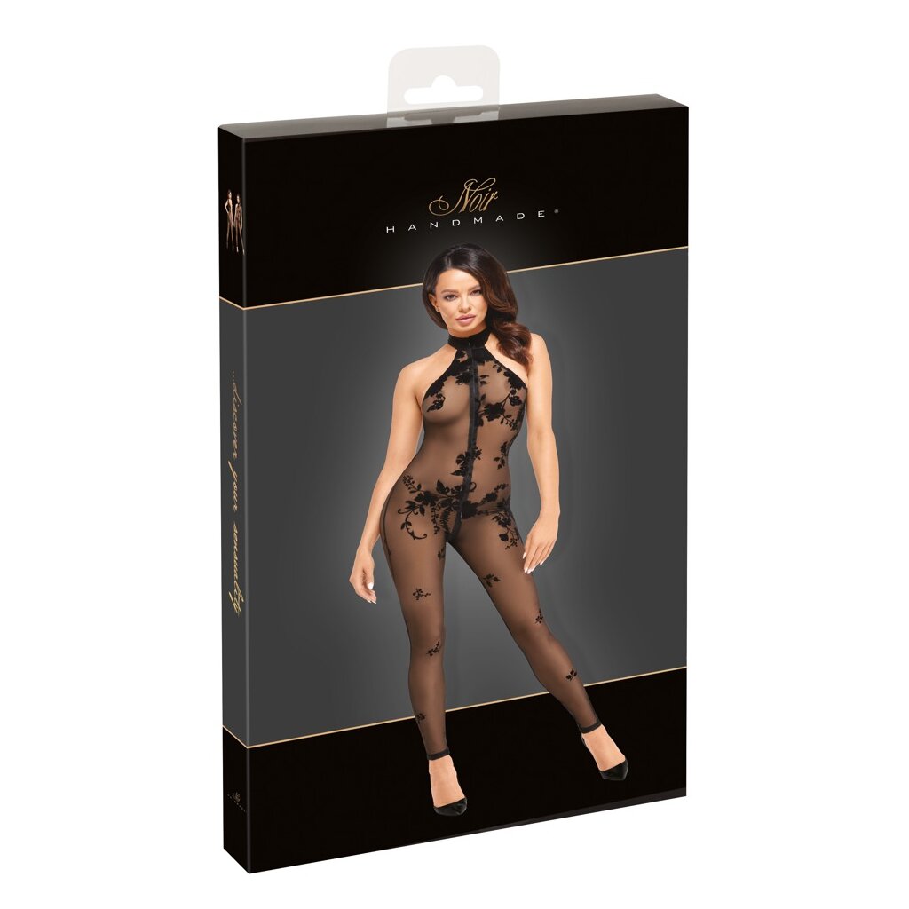 Off-the-shoulder jumpsuit from Noir with a long leg. Made entirely from fine black stretch with a velvet flock print in a floral tendril look. Fits softly and elastically like a second skin. With a practical 3-way zip that runs from the neckband through the crotch to over the bum!