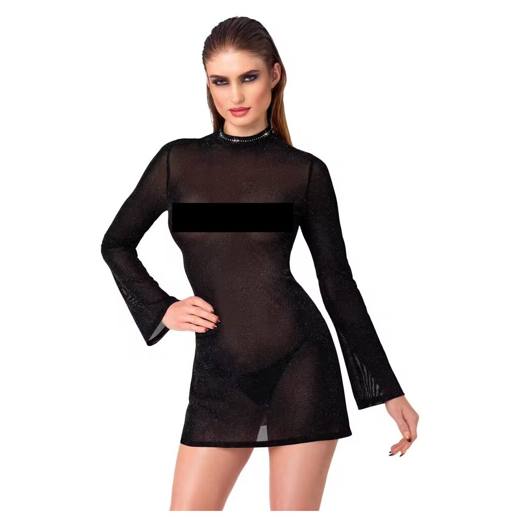 Mini-robe exclusive de Noir en fine transparence scintillante noire. Sa coupe élégante et fluide est sublimée par des détails étincelants.