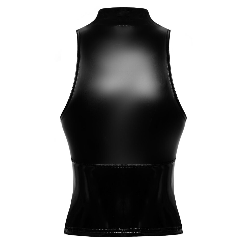 Ärmelloses, enges Top von Noir in einem eleganten schwarzen Mix aus Lack und Powerwetlook. Weich und dehnbar in allen Bereichen für eine enge Passform und hohen Tragekomfort. Mit kleinem Stehkragen und durchgehendem Reißverschluss auf der Vorderseite.