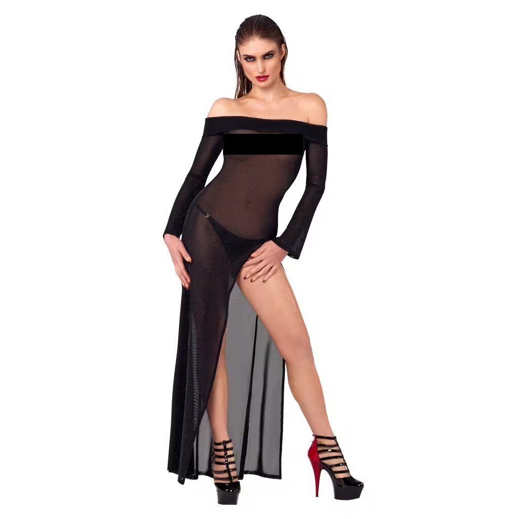 The elastic Carmen neckline creates a shoulder-free look, while the long trumpet sleeves add a stylish detail. A high side slit at the front of the skirt lends the dress a daring touch.