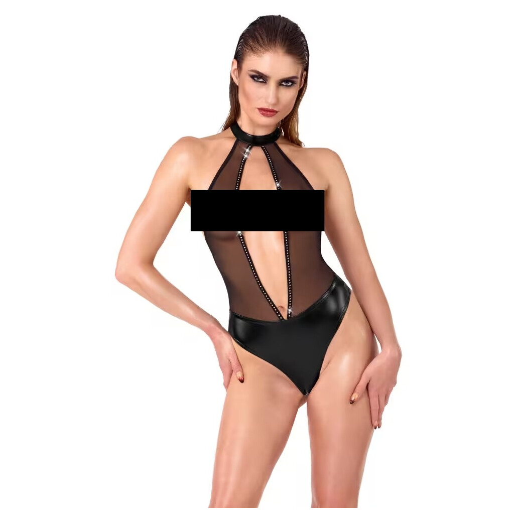 Exclusive Noir string body in a modern material mix of shiny power wetlook and delicate mesh. The daring shoulderless, backless design features a stand-up neckholder fastened at the nape.