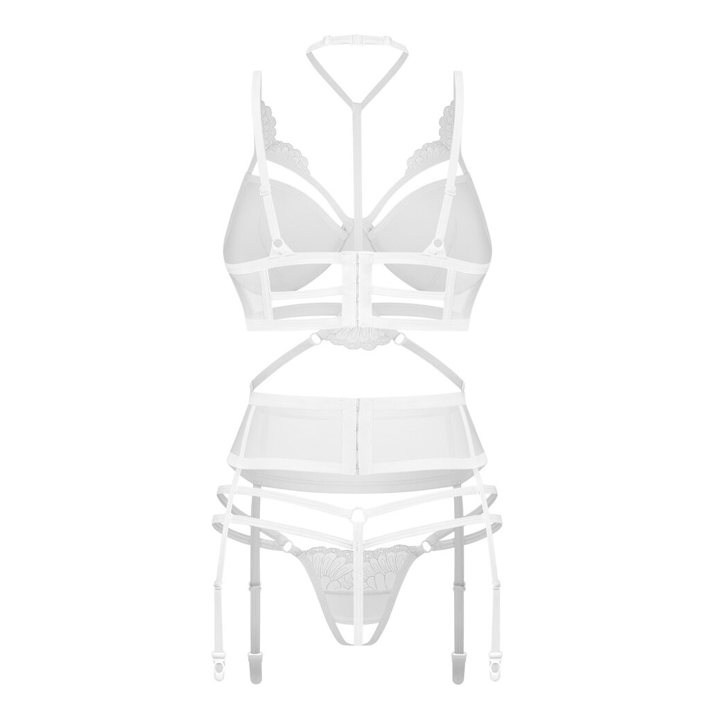 Set aus Bügel-BH, Strumpfgürtel und offenem String Premisis von Obsessive Premium. Feine weiße Transparenz mit sinnlichen Spitzendetails und dekorativen Stretch-Trägern. Weich und elastisch für maximalen Tragekomfort. Bügel-BH mit Trägern über den weichen Cups. Verstellbarer Hakenverschluss am Rücken. Die Träger sind ebenfalls verstellbar. Zwei verstellbare Träger vom Strumpfgürtel verbinden sich zu einem Brustriemen, der zum verstellbaren Choker-Kragen (mit Hakenverschluss) führt. Der Strumpfgürtel hat ebenfalls einen Hakenverschluss am Rücken. Die Strumpfhalter sind ebenfalls verstellbar. Der kleine Spitzenstring im Strap-Stil mit Ringen verführt mit seinem aufregenden offenen Schritt.
