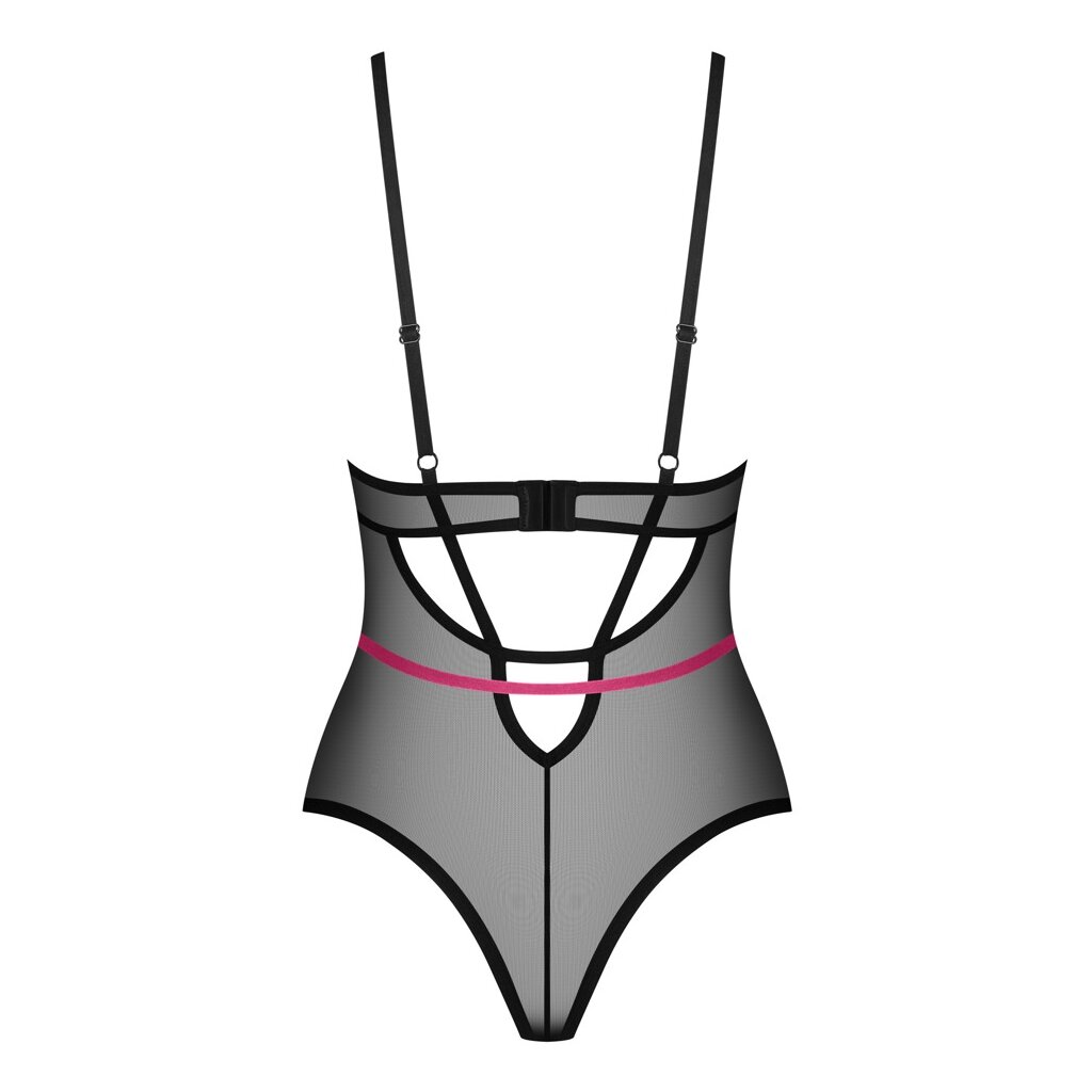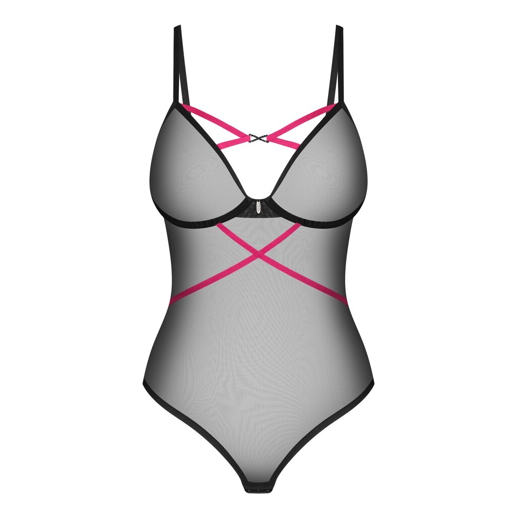 Novenes string body by Obsessive made of fine black powernet with pink strap accents at the front and back. Soft and stretchy for a high level of comfort. Between the soft cups with cleavage straps and a beautiful rhinestone element. The straps and hook fastening at the back can be adjusted to fit.