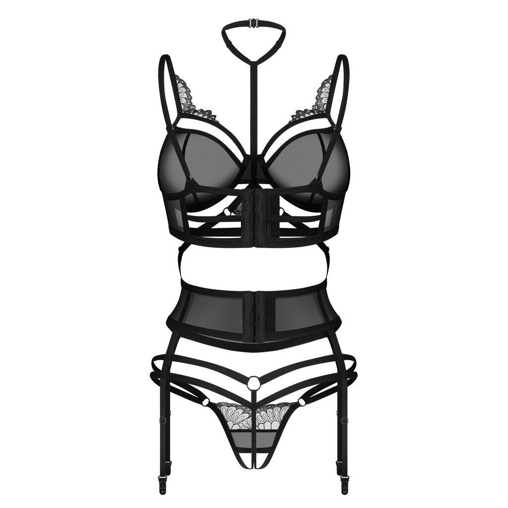 Underwired bra, suspender belt and open thong set Premisis by Obsessive Premium. Fine black transparency with sensual lace details and decorative stretch straps. Soft and elastic for maximum comfort. Underwired bra with straps over the soft cups. Adjustable hook fastening at the back. The straps are also adjustable. Two adjustable straps from the suspender belt combine to form a chest strap that leads to the adjustable choker collar (with hook closure). The suspender belt also has a hook closure at the back. The garters are also adjustable. The small lace thong in strap style with rings seduces with its exciting open crotch.