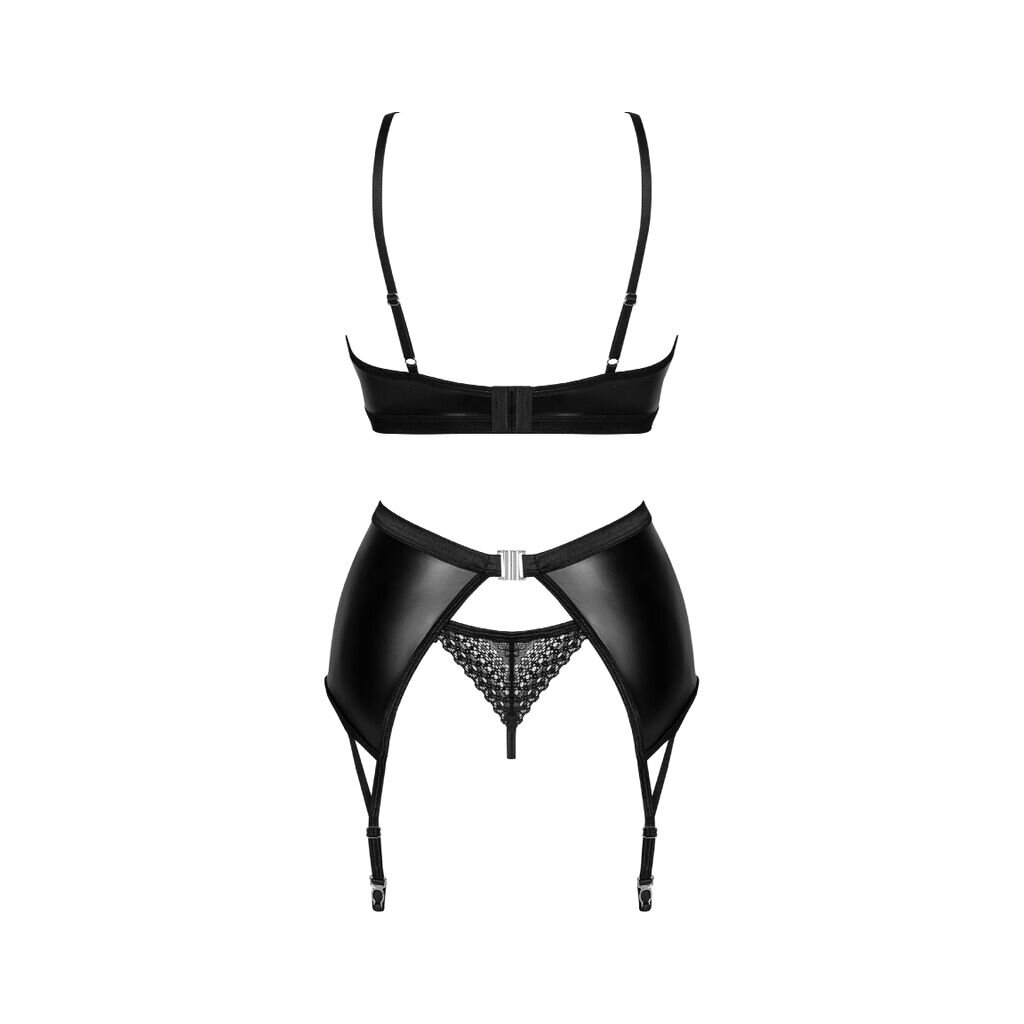 3-piece Norides set from Obsessive with underwired bra, suspender belt and thong that feels stretchy and soft. Underwired bra in a sophisticated style with straps and extravagant cleavage. The straps are adjustable, as is the hook fastener at the back. The suspender belt has a lace insert at the front and a hook fastener at the back. The suspender straps are adjustable and fit snugly. The thong seduces with a small lace triangle at the bottom.
