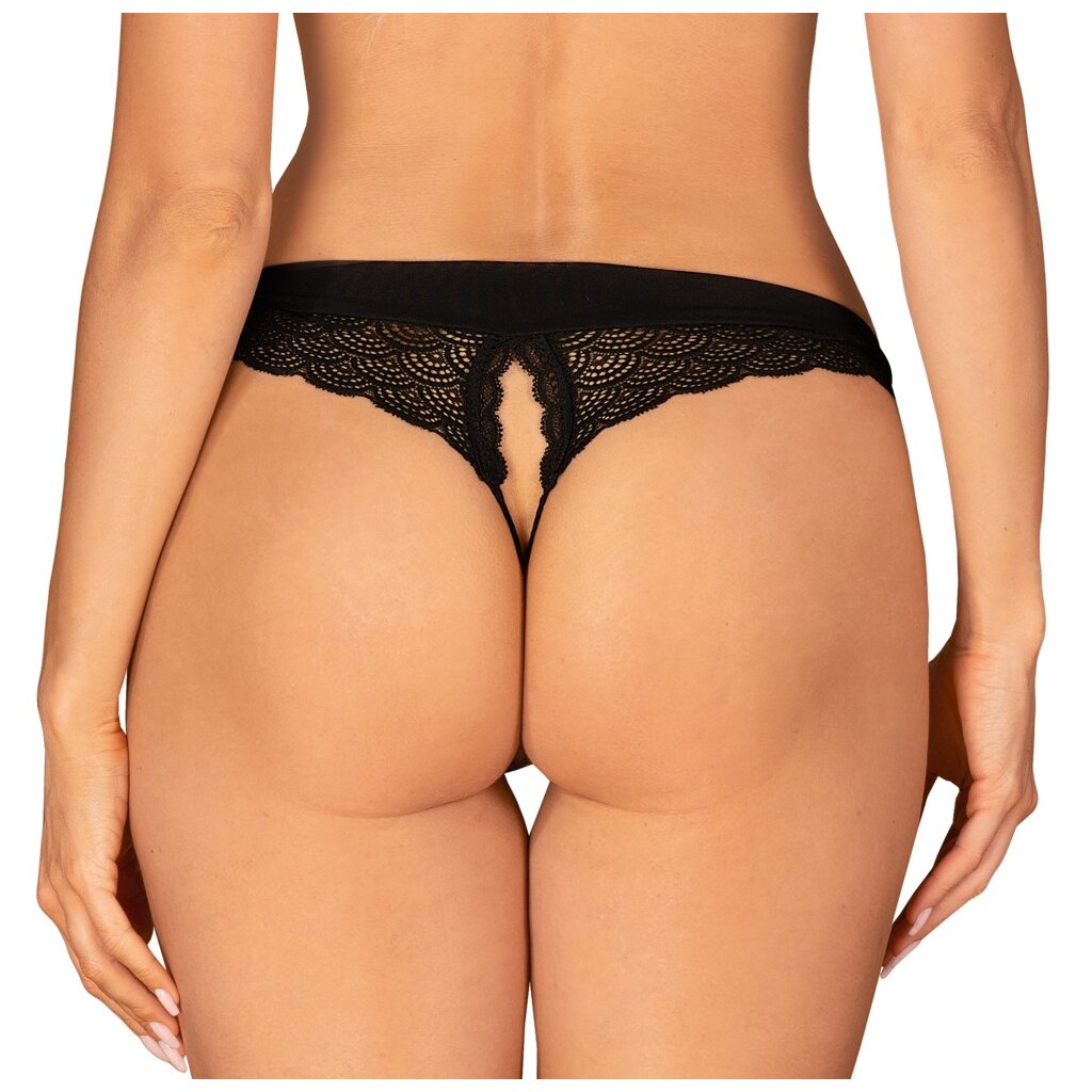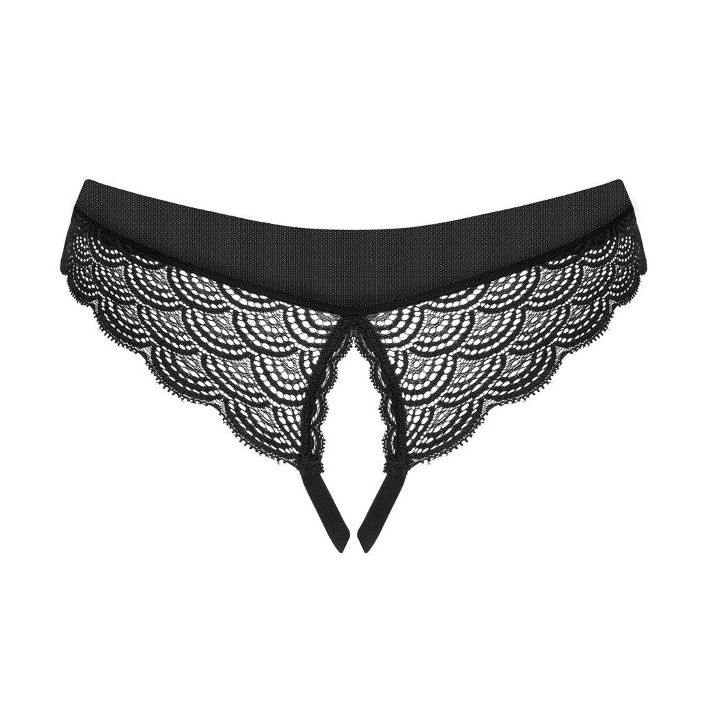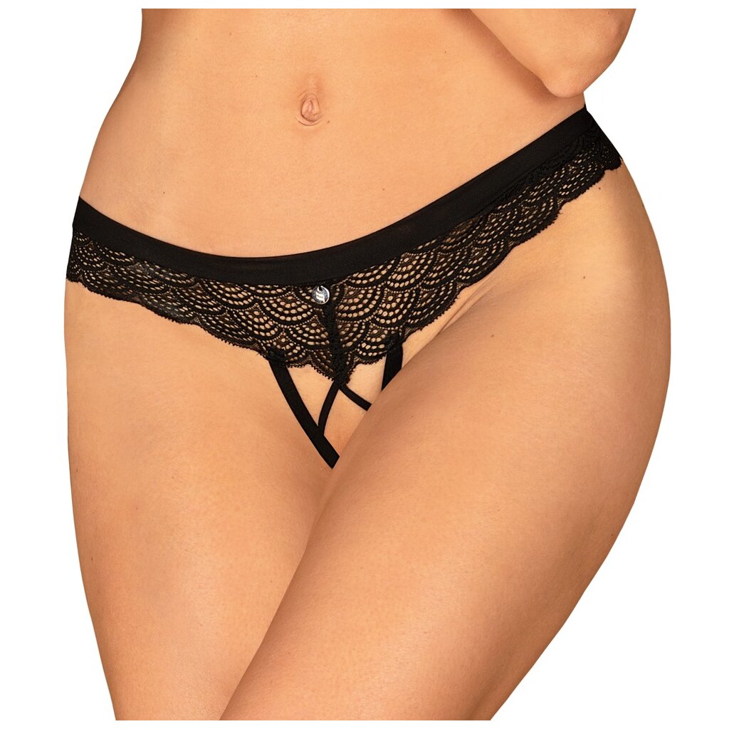Black Chemeris crotchless thong by Obsessive made of fine elasticated lace. Seductive open crotch with a strappy look. With a small jewellery element at the front on the comfortable stretch waistband. Size XS/S / Material composition: 90% polyamide, 10% elastane