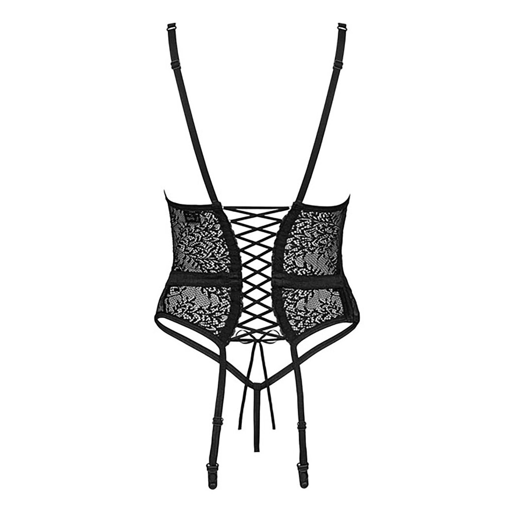 Suspender shirt and thong in the set Yaskana by Obsessive made of fine lace. Soft and elastic for maximum wearing comfort. In refined belly cut with waist band. Cups worked on underwire for perfect support and fit. Exciting back view with variable lacing. The straps and suspenders are adjustable to fit. The simple beautiful lace thong completes this seductive look.