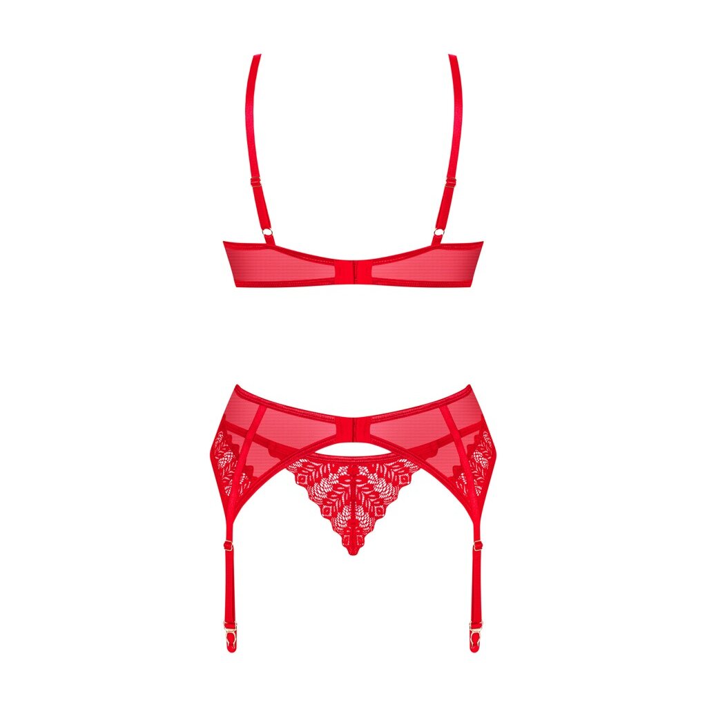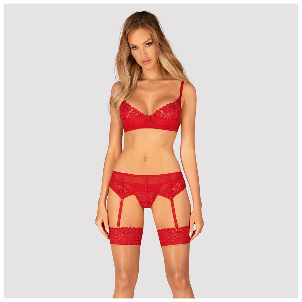 3-piece set Ingridia by Obsessive with underwired bra, suspender belt and thong. All in red fine transparency with beautiful lace details. Soft and elasticated all over for high wearing comfort. Padded underwired cups with a small decorative element for a beautiful cleavage. Bra and suspender belt with adjustable hook fastening at the back. The straps and suspender straps can also be adjusted to fit.