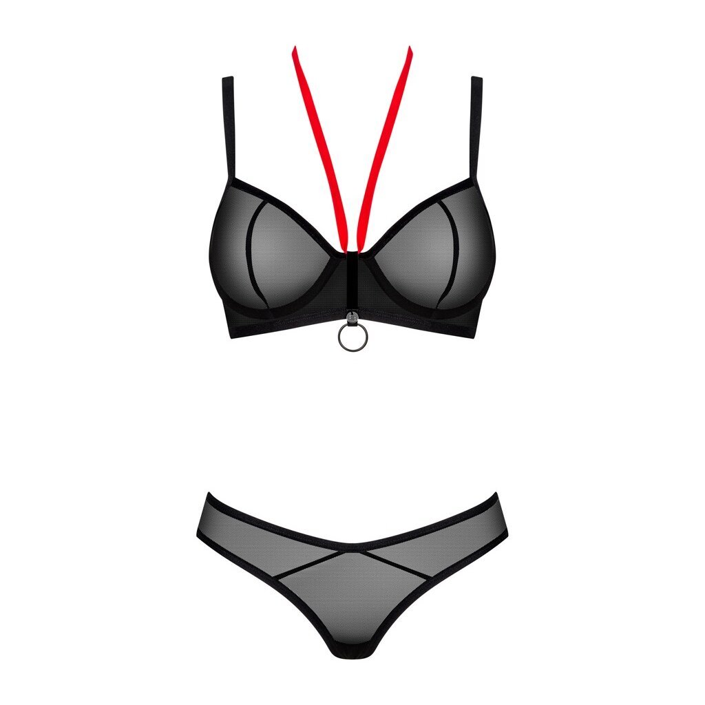 Bügel-BH und Tanga-Set Glandez von Obsessive in zarter schwarzer Transparenz. Weich und rundum elastisch für einen hohen Tragekomfort. BH mit rotem Neckholder für einen stilvollen Kontrast sowie einem Ring und kleinen Schmuckelement zwischen den Cups. Die Träger und der Hakenverschluss im Rücken sind verstellbar. Der raffinierte Schnitt des Strings mit hohem Bund betont verführerisch die Hüften und den Po.