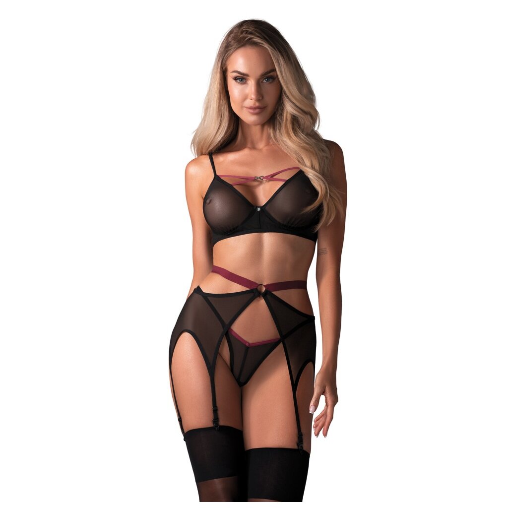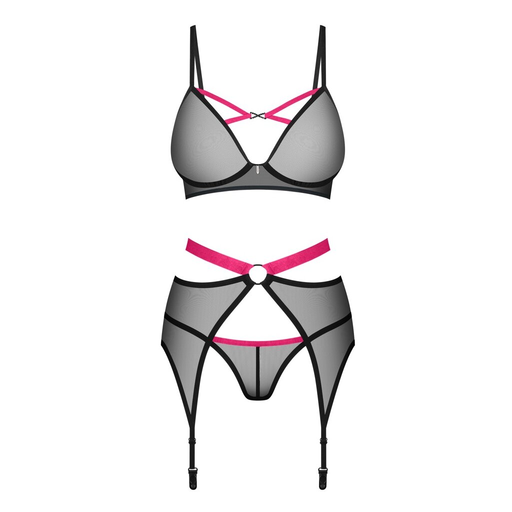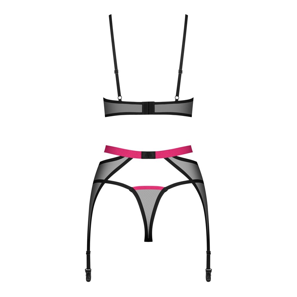3-piece Novenes suspender set by Obsessive with soft bra, suspender belt and V-string. Made from fine black powernet with pink accents. Bra with cleavage straps and a beautiful rhinestone element between the soft cups. The straps can be adjusted to fit. Just like the hook fastener at the back. The beautiful suspender belt seduces with a contrasting waistband and ring at the front. It has an adjustable hook fastener at the back and the suspender straps can also be adjusted to fit. The matching V-string completes this elegant transparent trio.