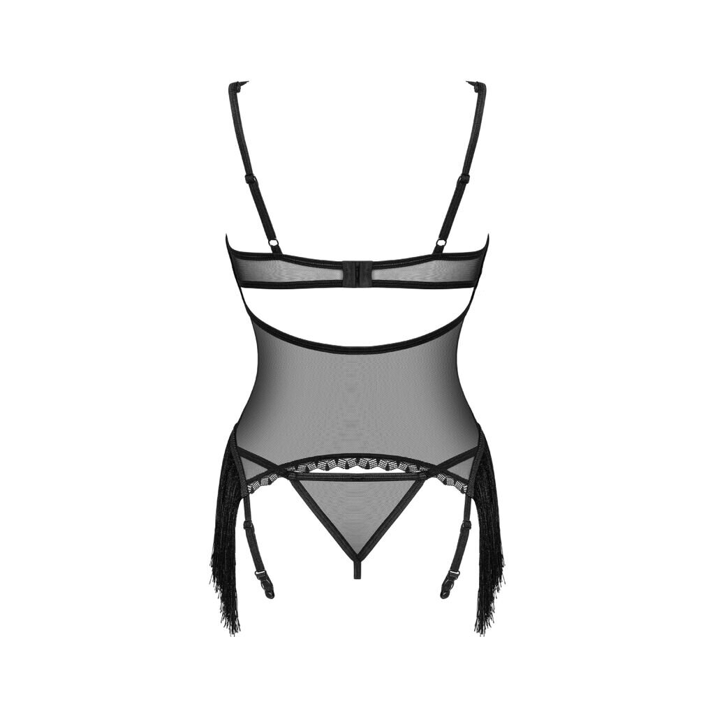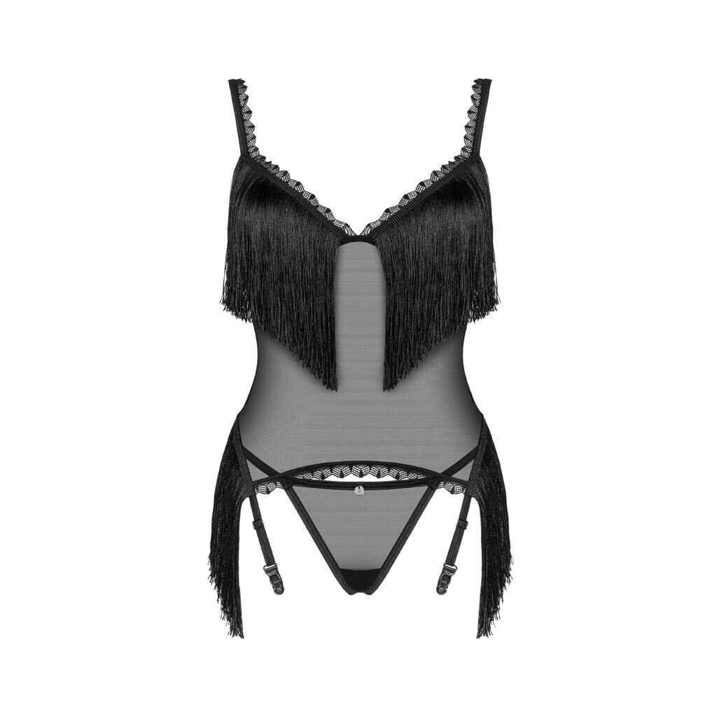 Strapshemd und Tanga im schwarzen Sherila-Set von Obsessive. Feiner transparenter Stretch-Tüll mit zarten Spitzendetails. Mit schwingenden, glänzenden, weichen Fransen über Busen und Hüfte. Zweiteiliger Look am Rücken mit verstellbarem Hakenverschluss. Auch die Träger und Strapshalter lassen sich in der Passform verstellen. Transparenter String mit kleinem Zierelement auf der Vorderseite.