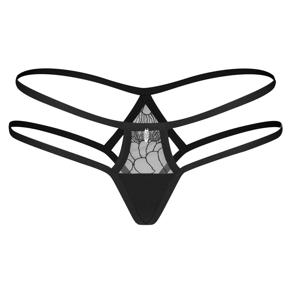Schwarzer String von Obsessive mit zarter Spitze und kleinen Zierdetails vorne. Stilvoller, vollständig elastischer Doppelriemenbund.