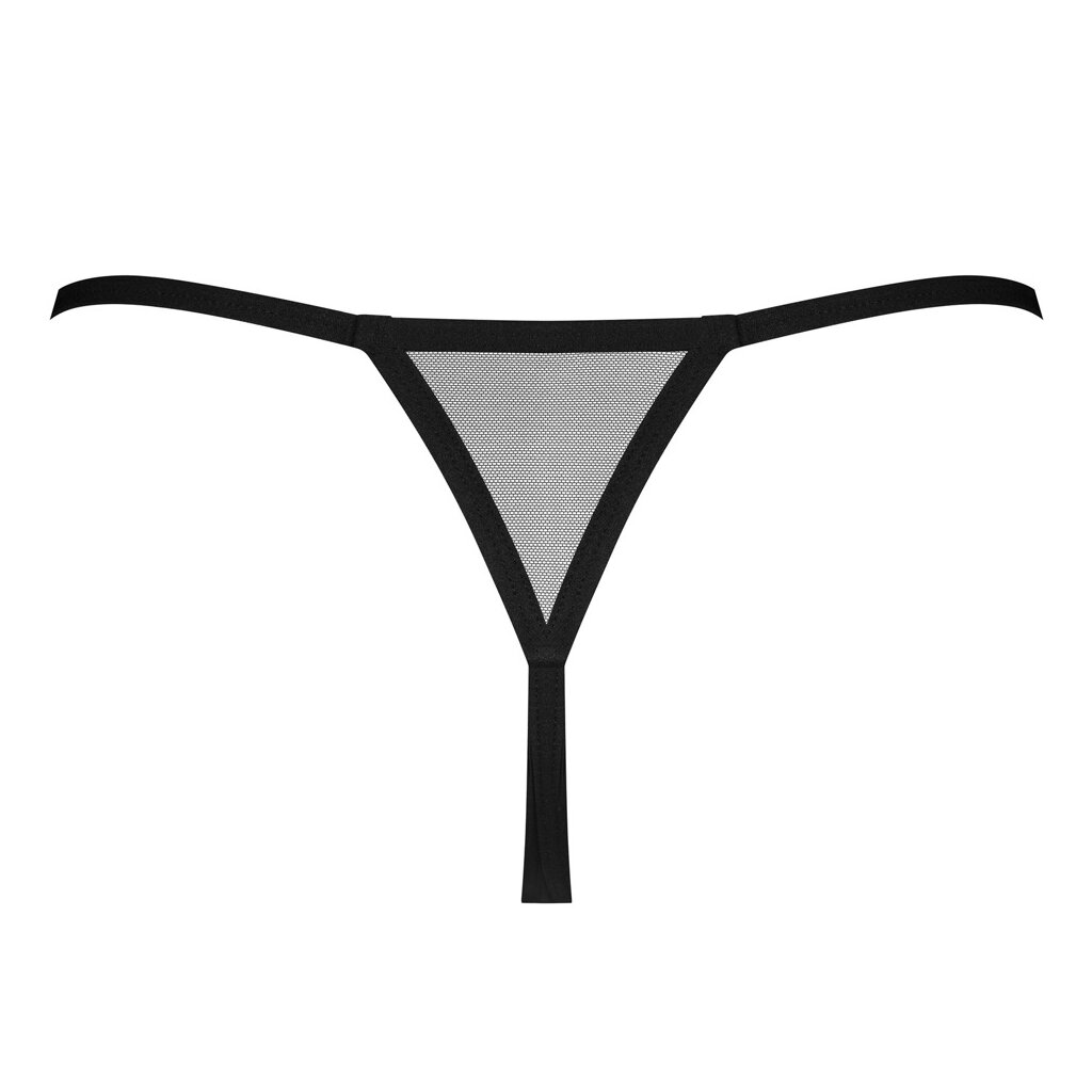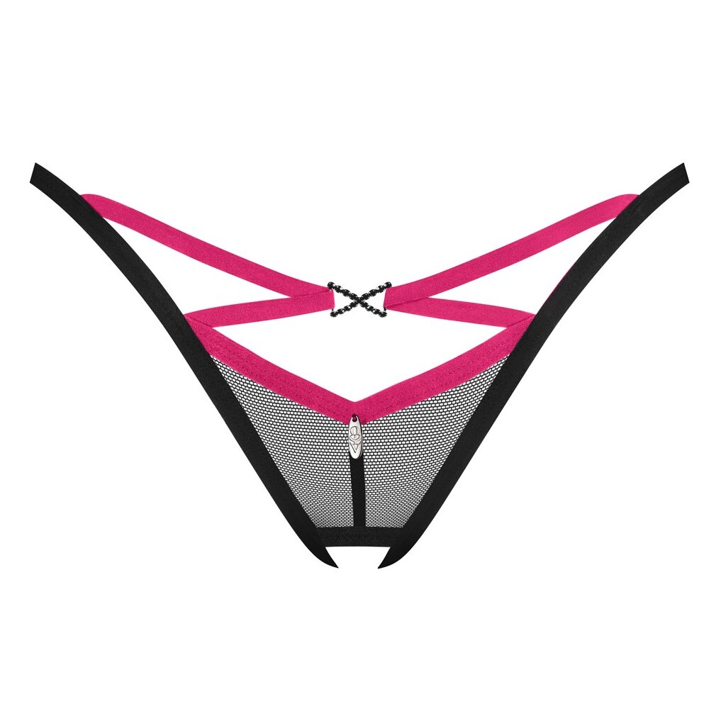Black, transparent Novenes crotchless thong by Obsessive made from soft powernet. With pink straps at the front and a beautiful rhinestone element at the waistband. Seductively open at the crotch.