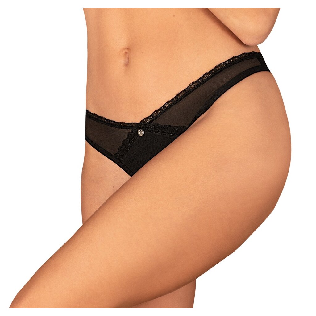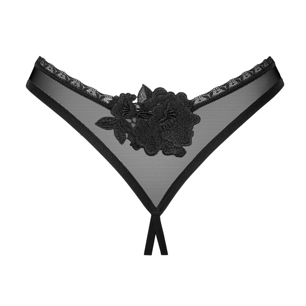 Schwarz-transparenter Riostring ouvert Latinesa von Obsessive aus weichem Stretchtüll mit Spitzenbordüren und kleinem Schmuckelement vorne am Bund. Im Schritt verführerisch offen und über dem Po mit aufwendiger Stickerei verziert. Größe XS/S / Materialzusammensetzung: 94% Polyamid, 6% Elasthan