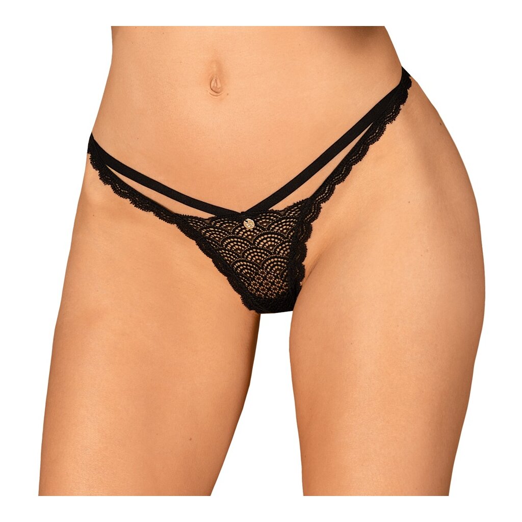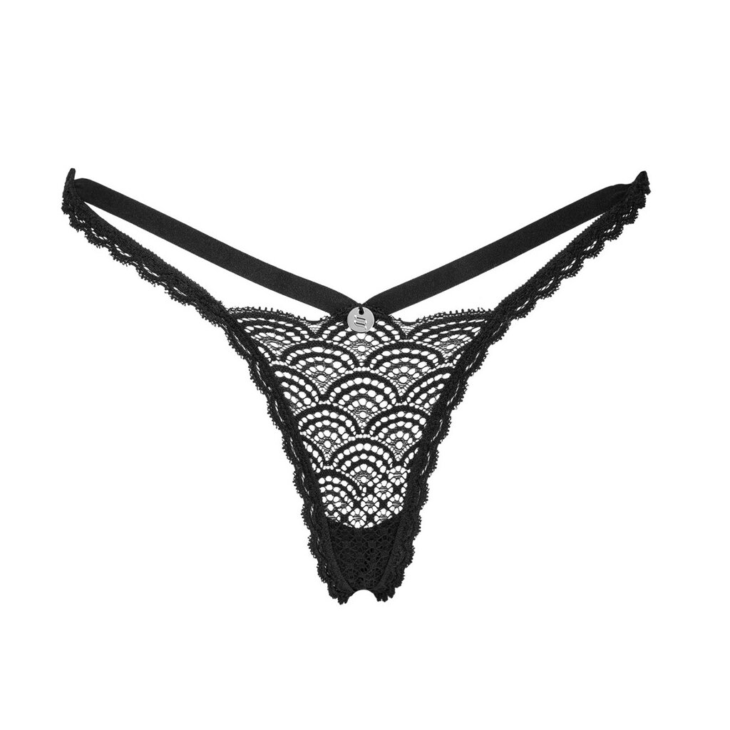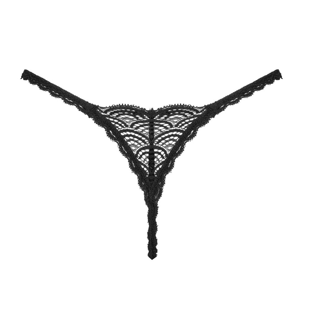 Black Chemeris thong by Obsessive made from soft, stretchy lace. Emphasising cut with stylish straps and a small decorative element at the front of the waistband. Size XS/S / Material composition: 90% polyamide, 10% elastane