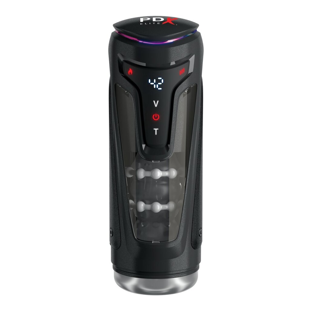 Masturbateur Moto-Bator Pro de PDX Elite dans un étui pratique et discret. Il dorlote le pénis sur toute sa surface grâce à de puissantes vibrations et à un massage intensif de la poussée à l'aide de 3 anneaux en forme de perles. La fonction de chauffage (2 modes) peut être activée par simple pression d'un bouton pour porter rapidement le masturbateur à la bonne température corporelle et d'utilisation.