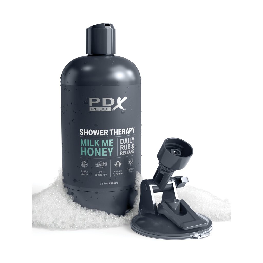 Le masturbateur Shower Therapy Milk Me Honey de PDX Plus ressemble, de l'extérieur, à une bouteille de shampoing neutre. Mais lorsque vous dévissez le bouchon inférieur, vous trouverez à l'intérieur une réplique réaliste d'une vulve et d'un vagin avec une texture excitante pour un massage intense du pénis lors d'une branlette. Le bouchon de la bouteille sert de contrôle de la succion pour maîtriser les sensations de succion de la fellation en l'ouvrant et en le refermant simplement.