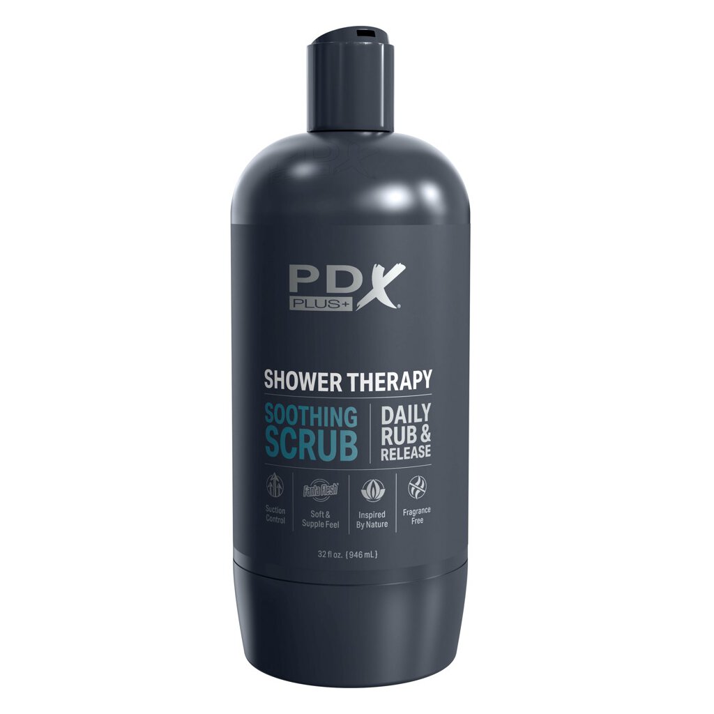 Le masturbateur Shower Therapy Soothing Scrub de PDX Plus ressemble de l'extérieur à une bouteille de shampoing neutre. Mais lorsque vous dévissez le bouchon inférieur, vous trouverez à l'intérieur une réplique réaliste d'une vulve et d'un vagin avec une texture excitante pour un massage intense du pénis lors d'une branlette. Le bouchon de la bouteille sert de contrôle de la succion pour maîtriser les sensations de succion de la fellation en l'ouvrant et en le refermant simplement.